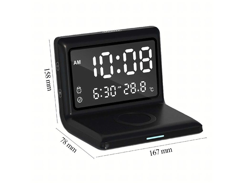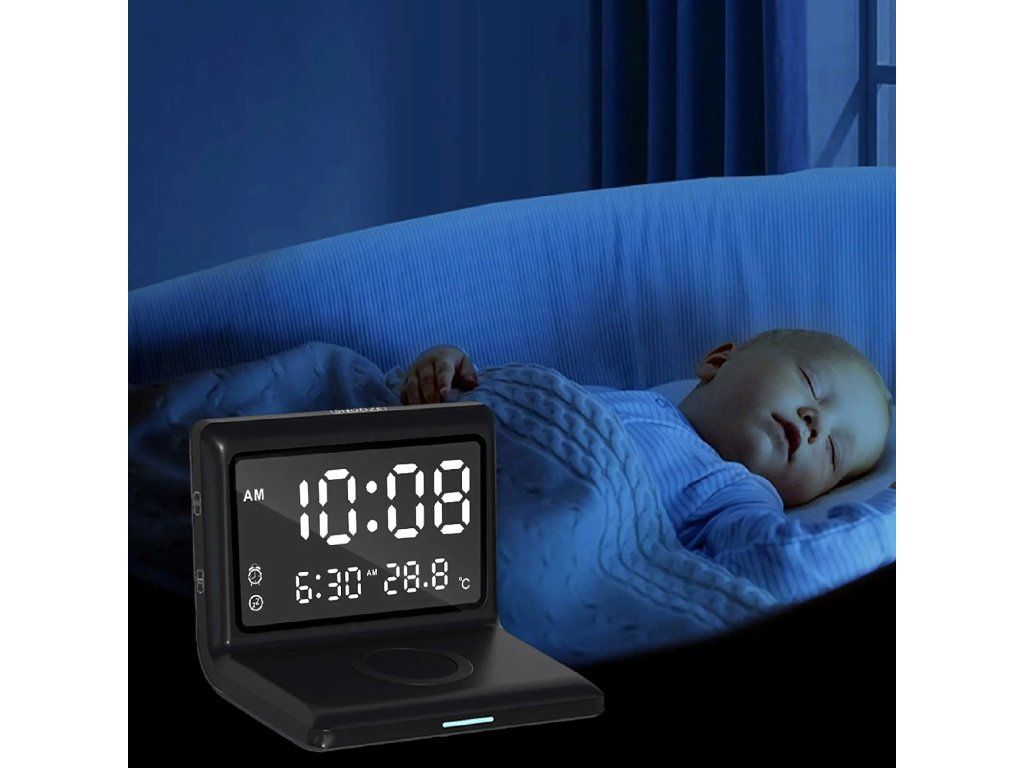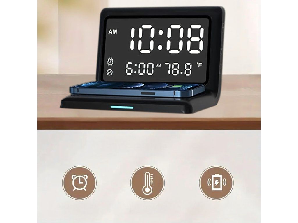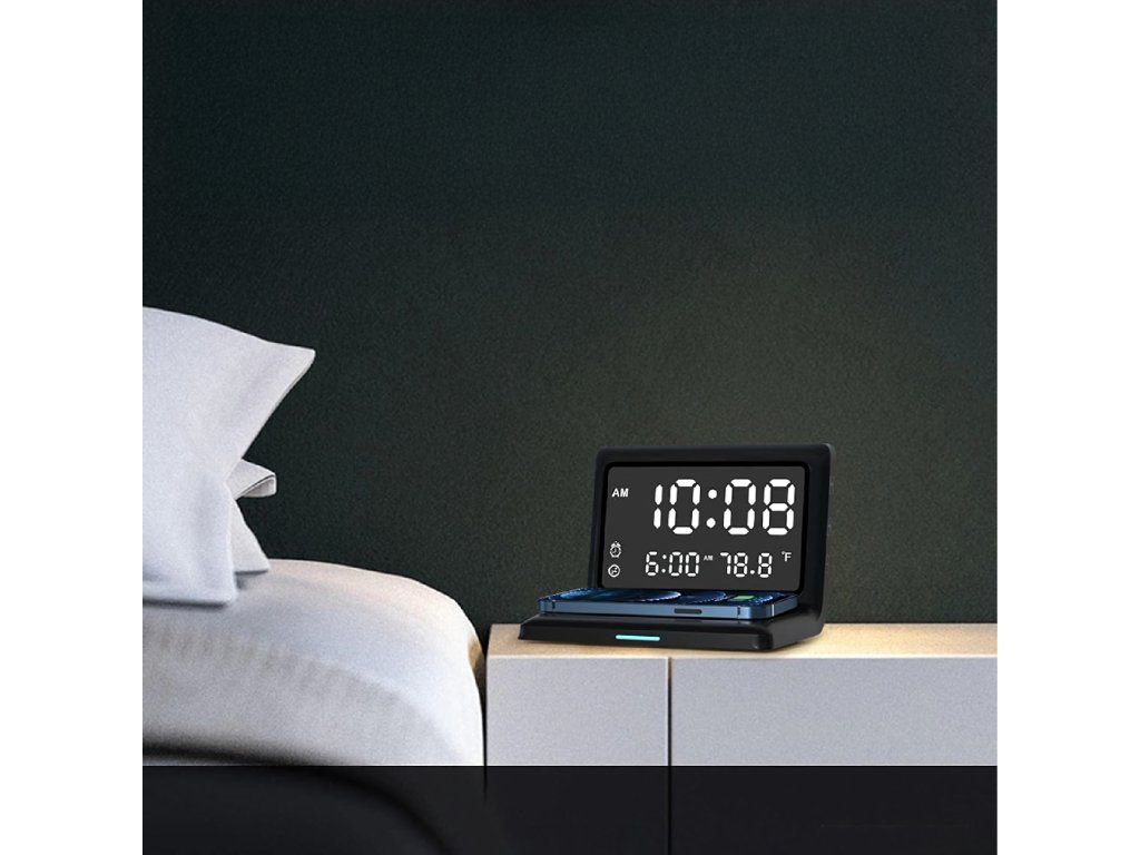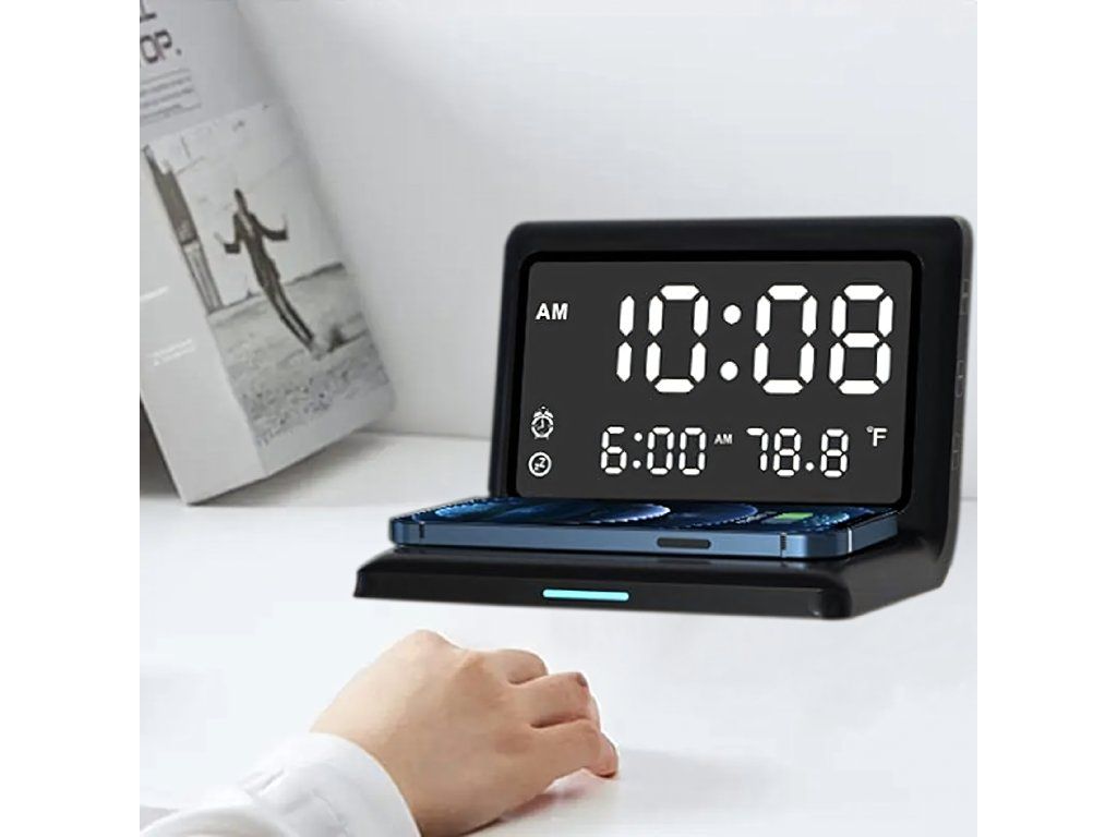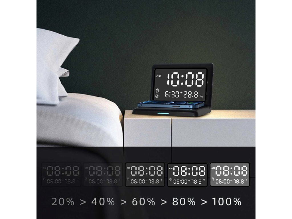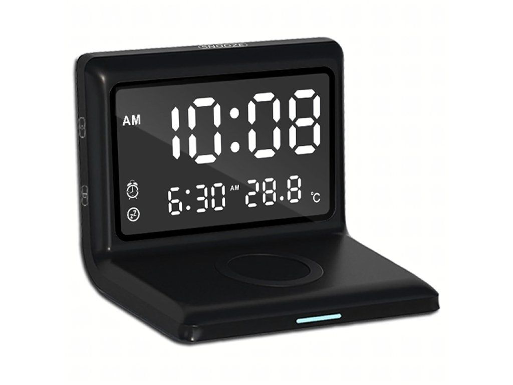 3v1 digitální budík s bezdrátovou nabíječkou 15 W, teploměrem a zrcadlem