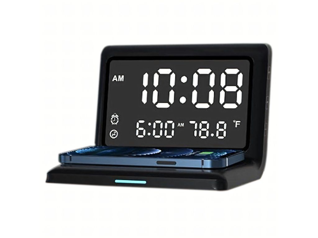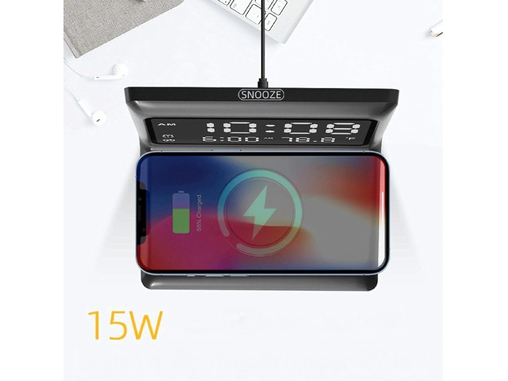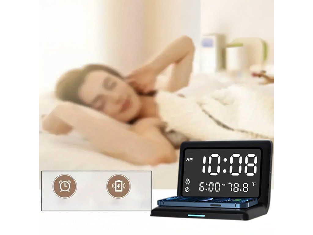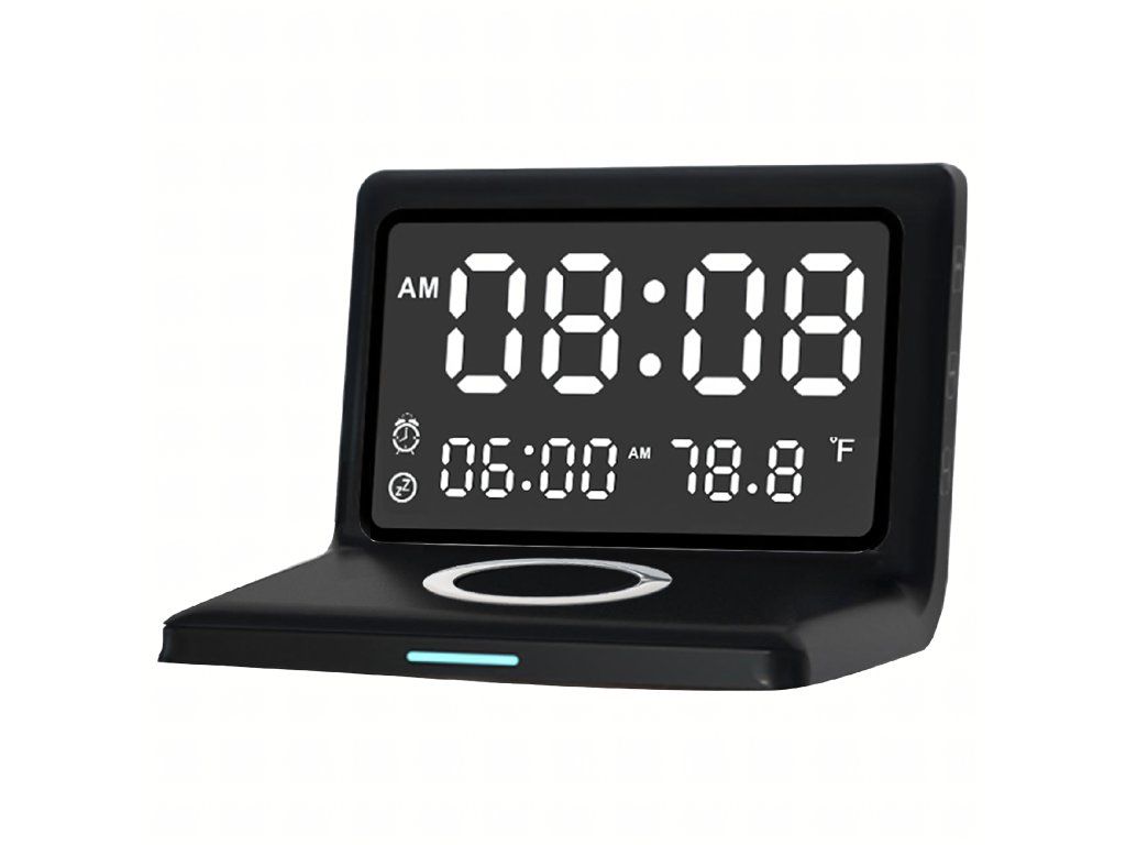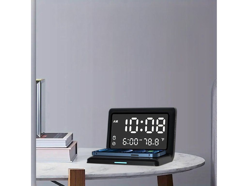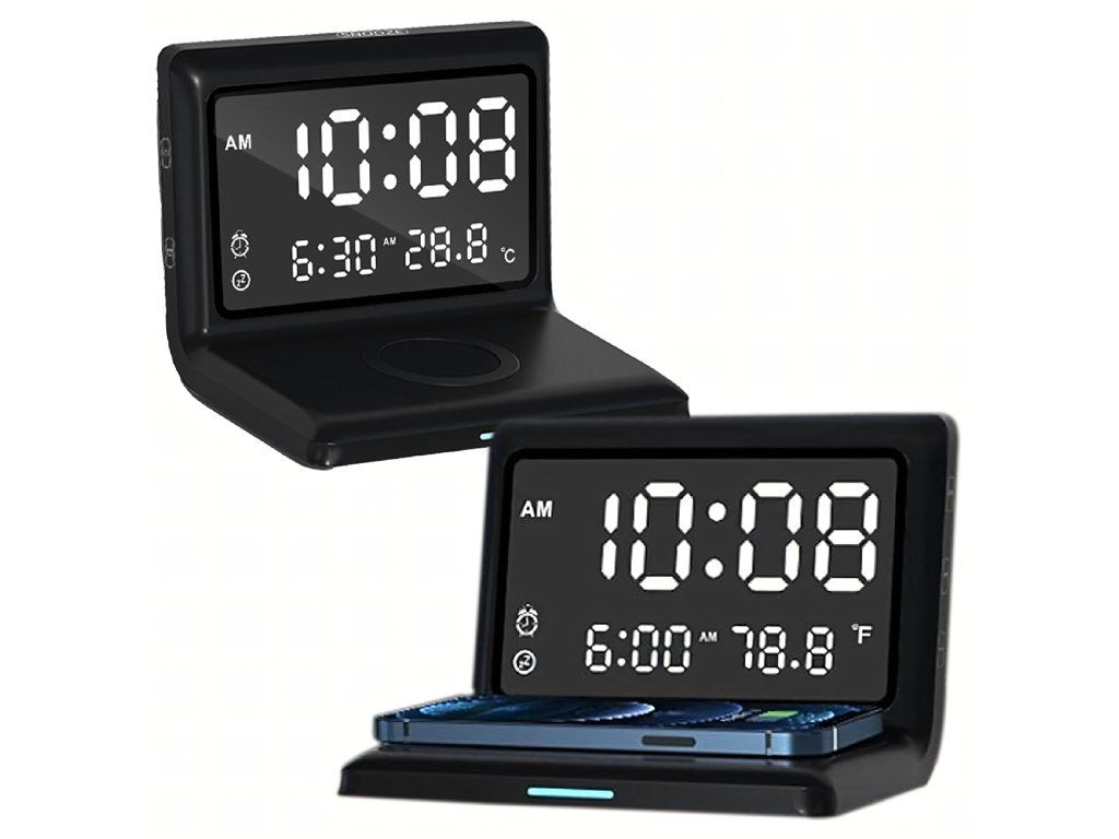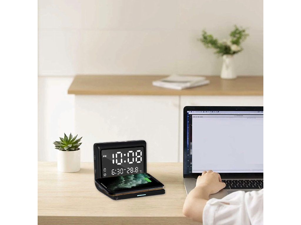 3v1 digitální budík s bezdrátovou nabíječkou 15 W, teploměrem a zrcadlem