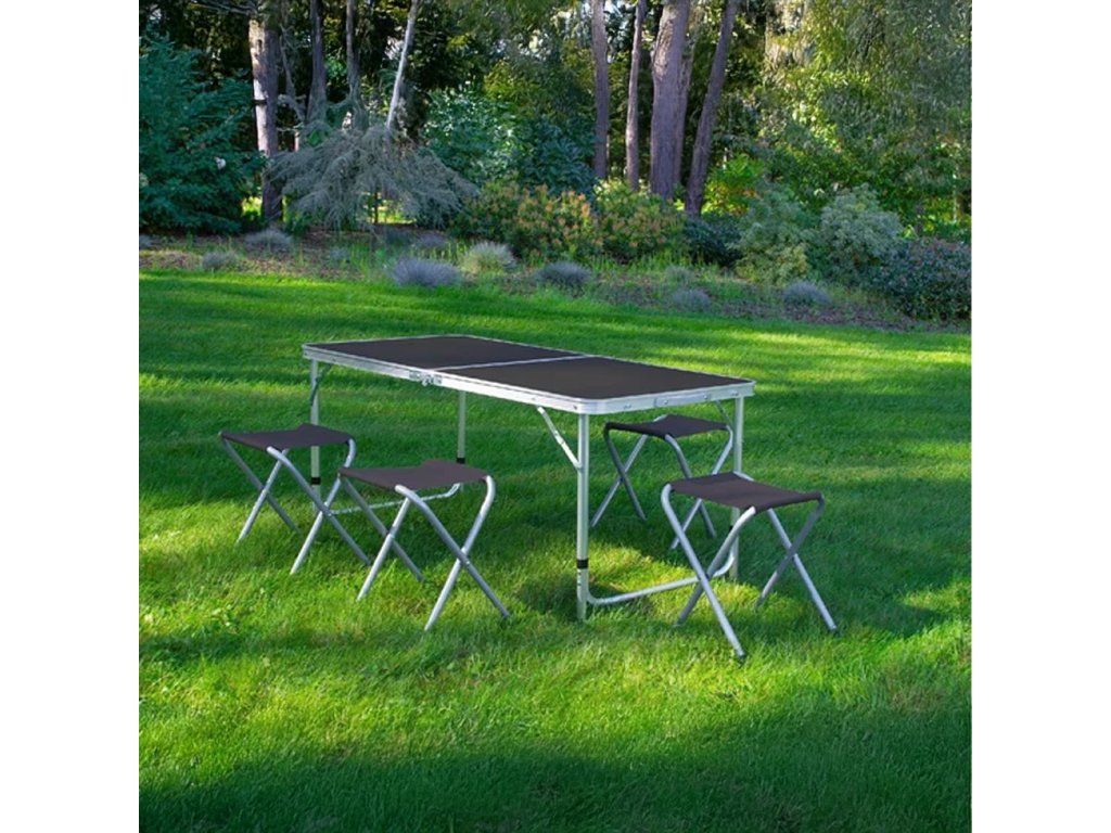 Sada se skládá z jednoho velkého skládacího stolku a čtyř skládacích židlí. Celý set lze složit do kompaktního kufříku s rukojetí, což usnadňuje přepravu a skladování.