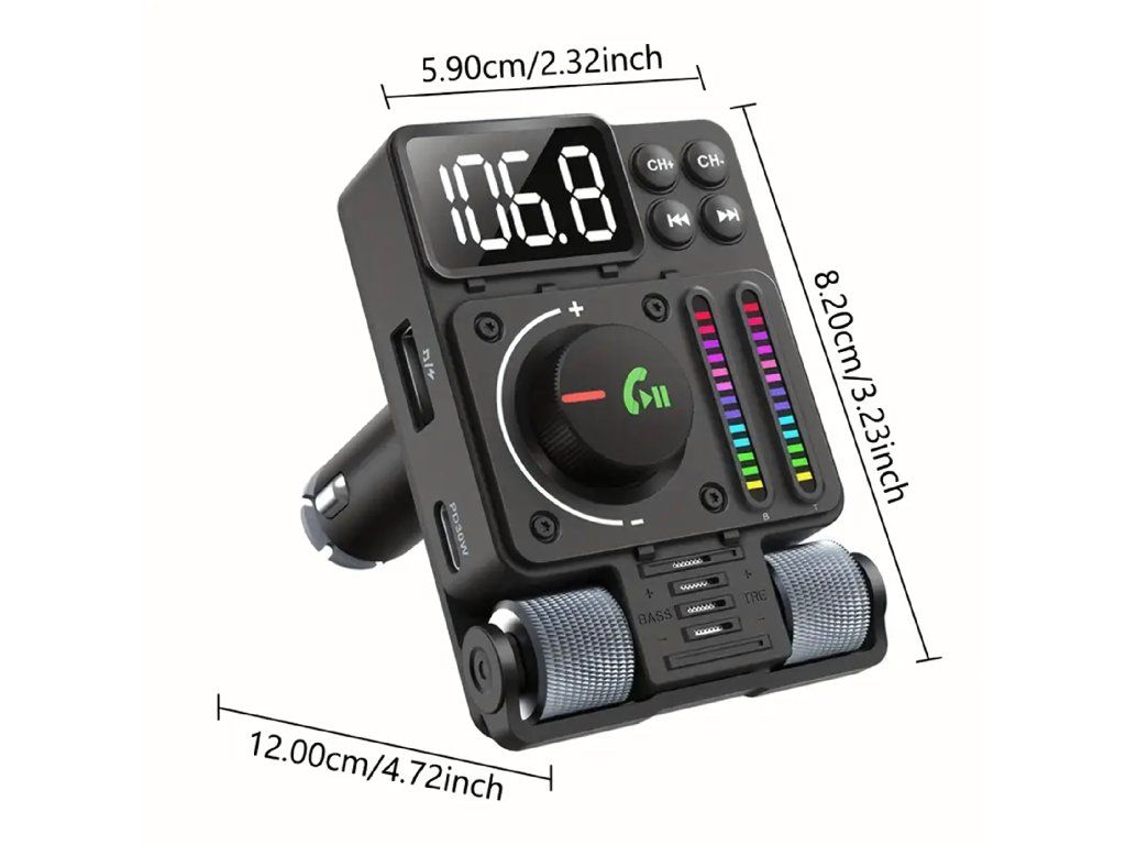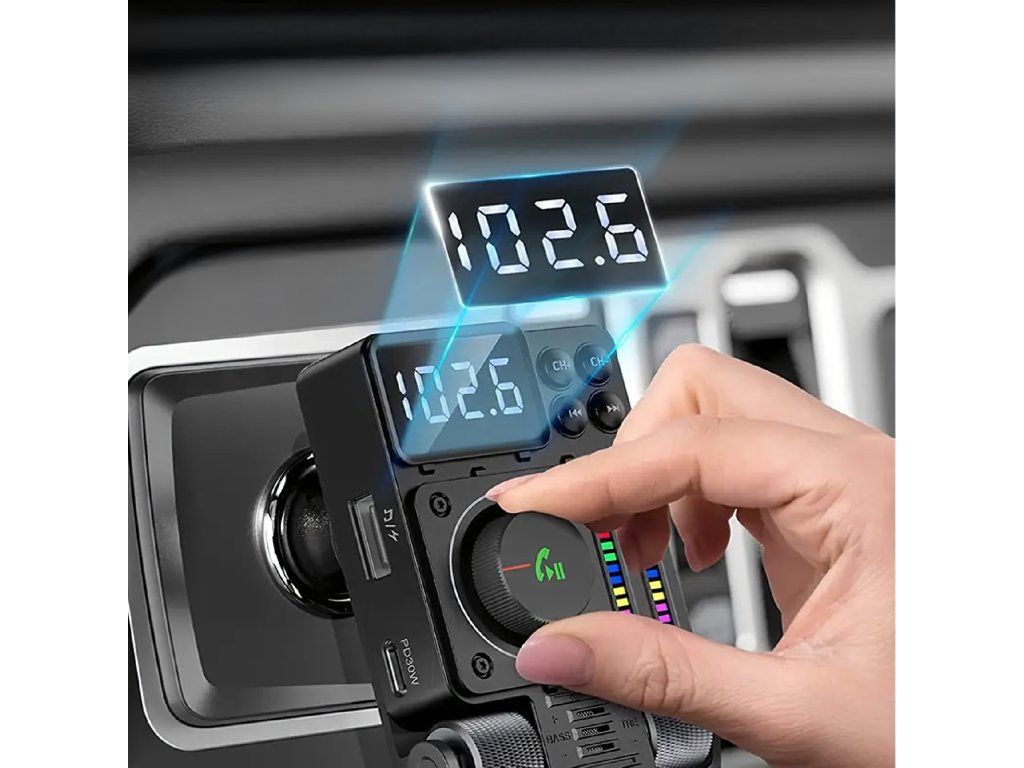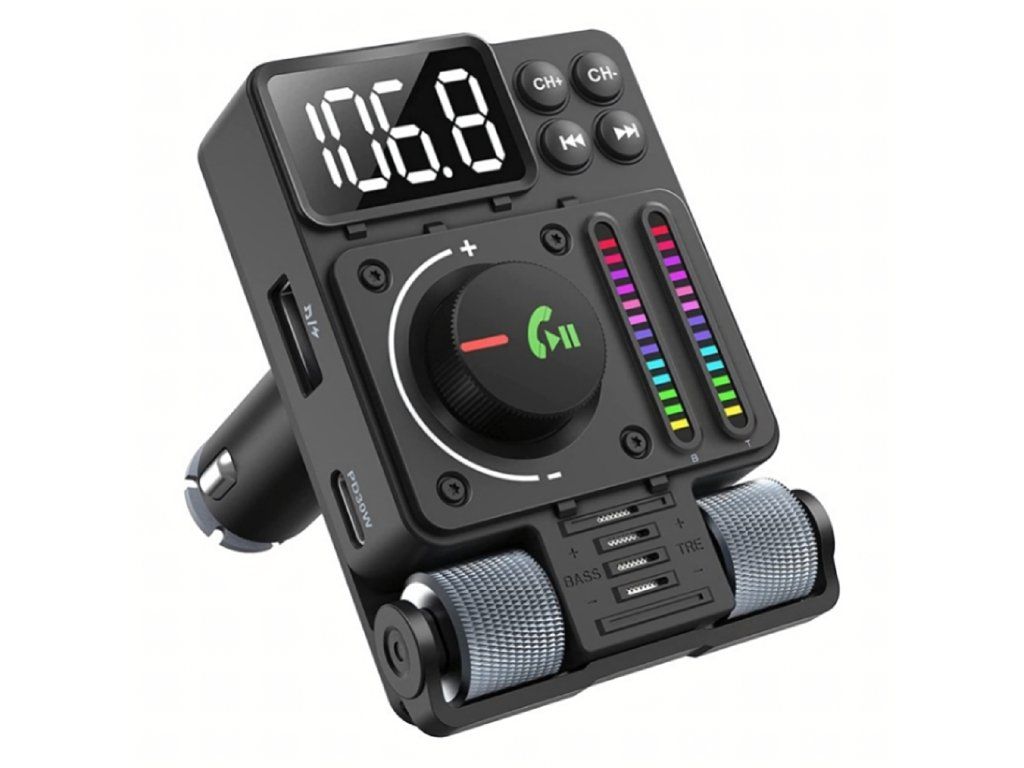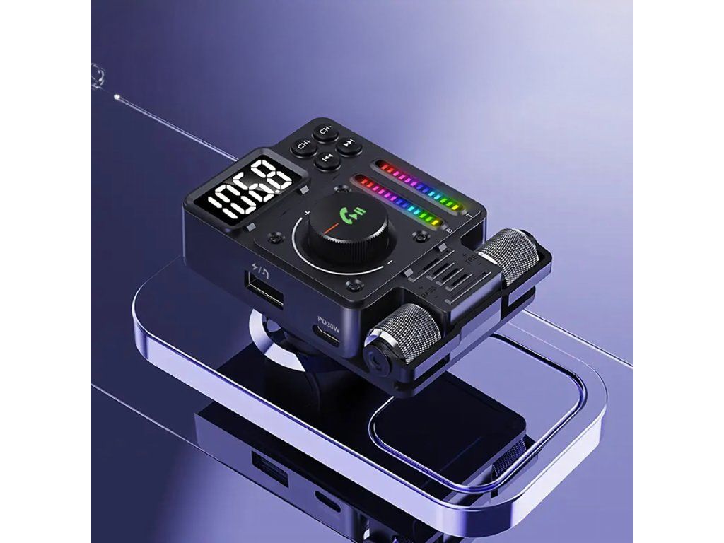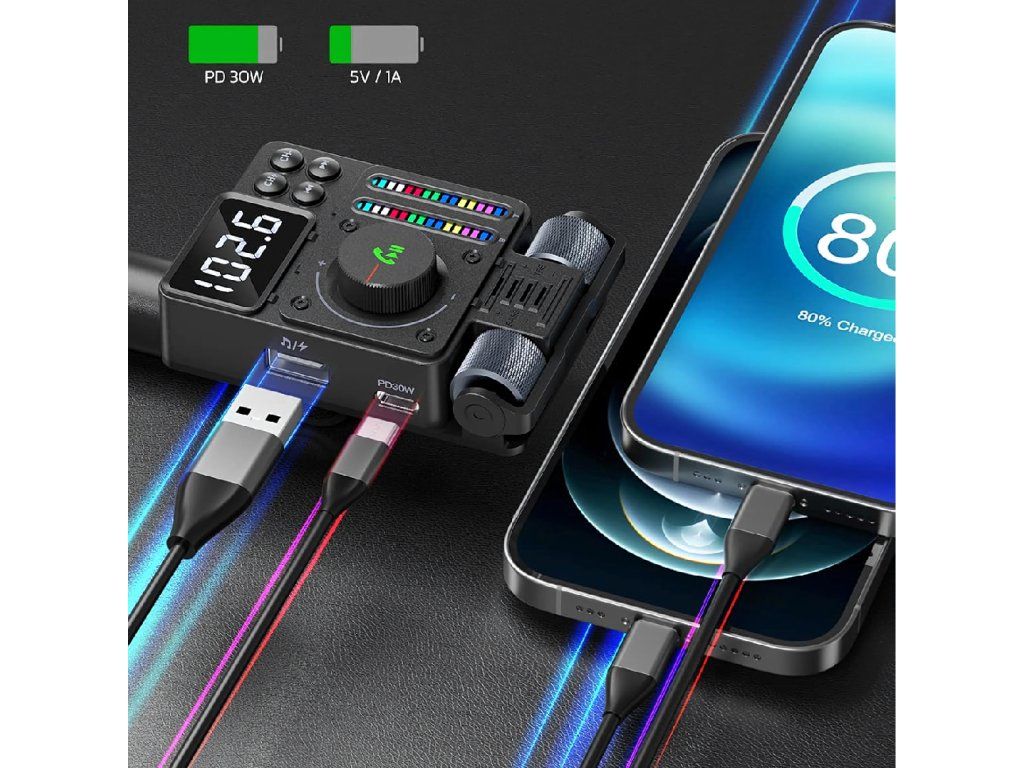 Multifunkční automobilový Bluetooth 5.3 vysílač s nabíjením PD 30 W, přehráváním hudby, čistými hovory přes hlasitý odposlech a barevným LED podsvícením – ideální způsob, jak si dopřát pohodlí a moderní technologii ve svém autě.