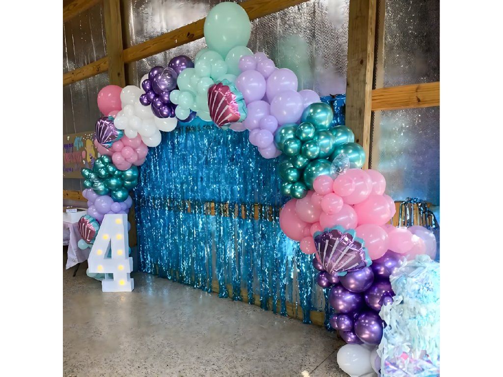♀️ Motiv mořské panny – fóliové balóny ve tvaru ocasu mořské panny a mušlí vytvářejí jedinečnou pohádkovou atmosféru.