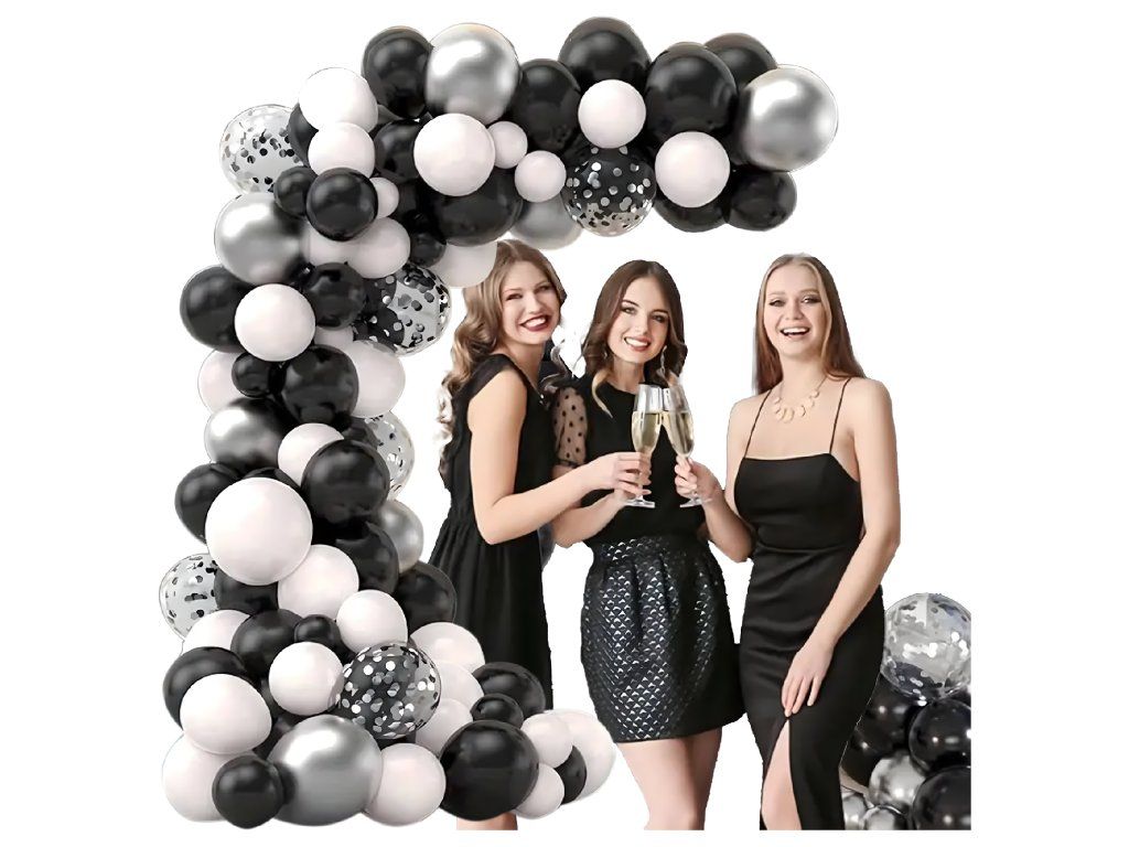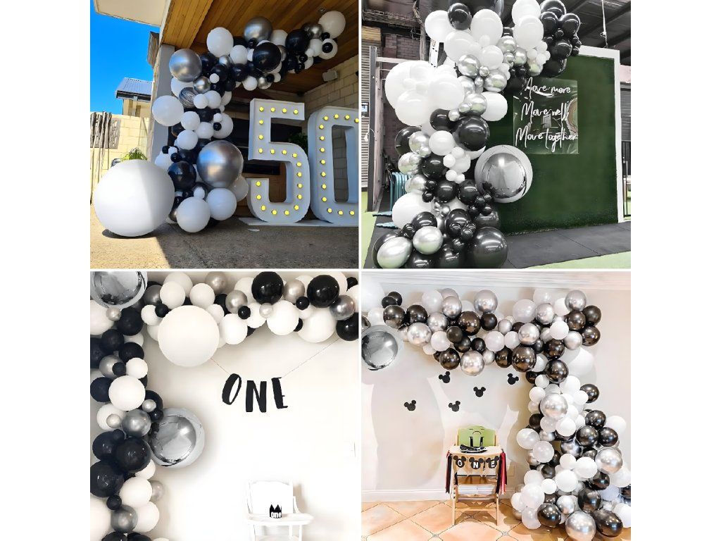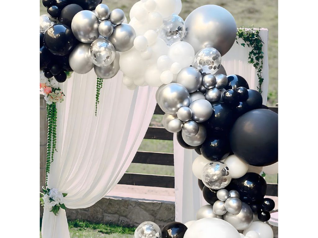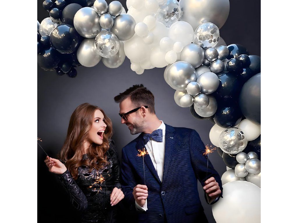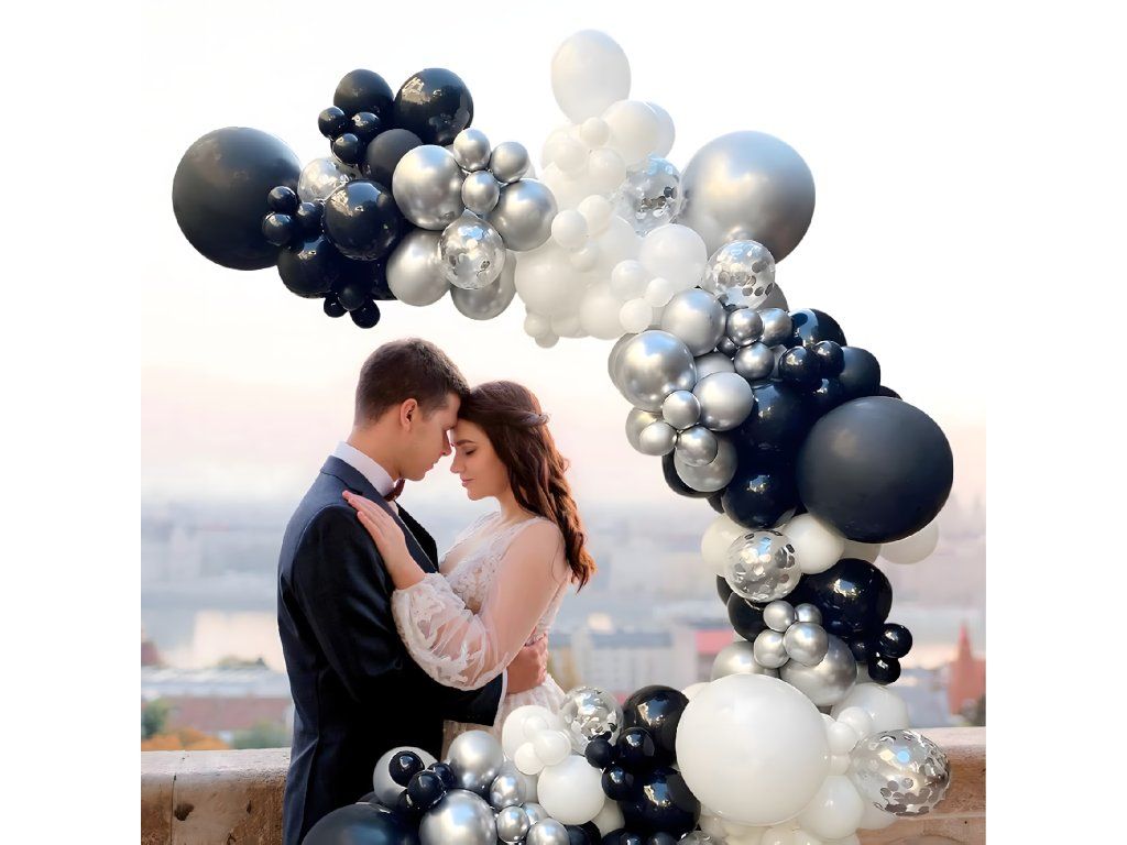 Dodávejte své akci eleganci! Vyberte si černobílou a stříbrnou balónkovou girlandu se 107 prvky a ohromte hosty výjimečnou dekorací.