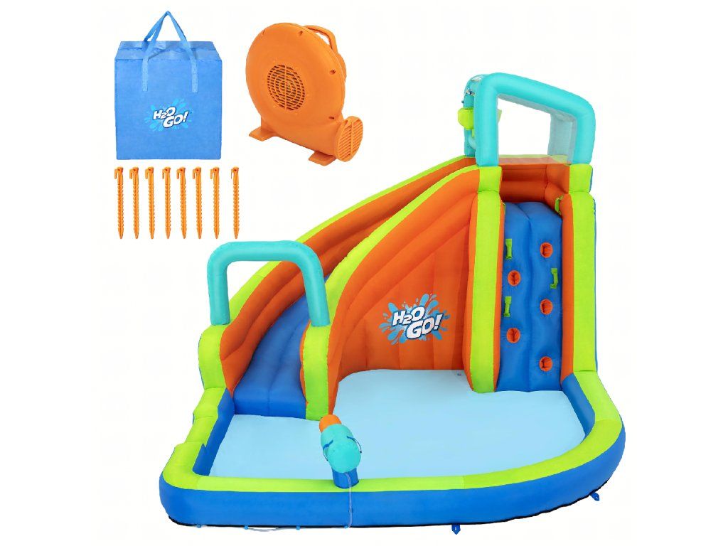 Součástí balení je: skluzavka, dmychadlo, hadice na stříkání vody, kotvící vak, záplaty, taška na skladování a upevňovací kolíky.