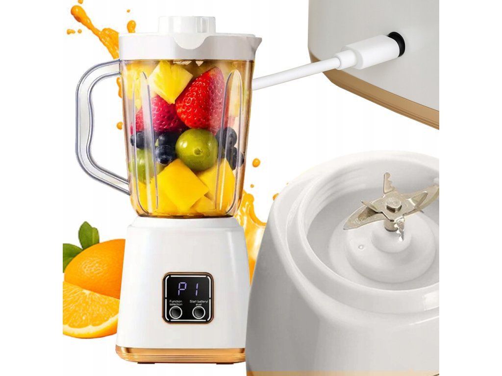 Nádoba mixéru je vyrobena z odolného plastu, který je lehký a snadno se čistí. Nůžky z nerezové oceli zaručují efektivní drcení ovoce, zeleniny a ledu. Pevná základna zajišťuje stabilitu při práci a zařízení je navíc vybaveno USB portem pro nabíjení.
