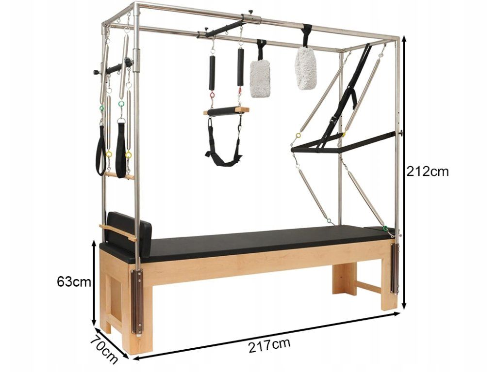 Cadillac reformer pilatespostel je univerzální zařízení určené pro posilovací, protahovací a rehabilitační cvičení. Celonerezová konstrukce rámu umožňuje provádět širokou škálu cviků v poloze na zádech i v zavěšení. Ideální pro domácí použití i v profesionálních pilates studiích, fyzioterapeutických ordinacích nebo centrech funkčního tréninku.