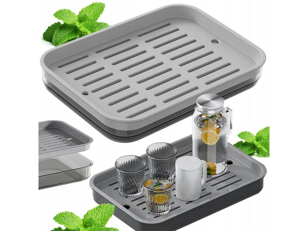 Podnos je vybaven vyjímatelnou perforovanou vložkou, která umožňuje volný odtok vody po umytí nádobí nebo ovoce. Spodní část podnosu zachycuje přebytečnou vodu, takže pracovní deska zůstává suchá a čistá. Je to ideální řešení pro sušení šálků, talířů nebo příborů bez nutnosti používat velké odkapávače.