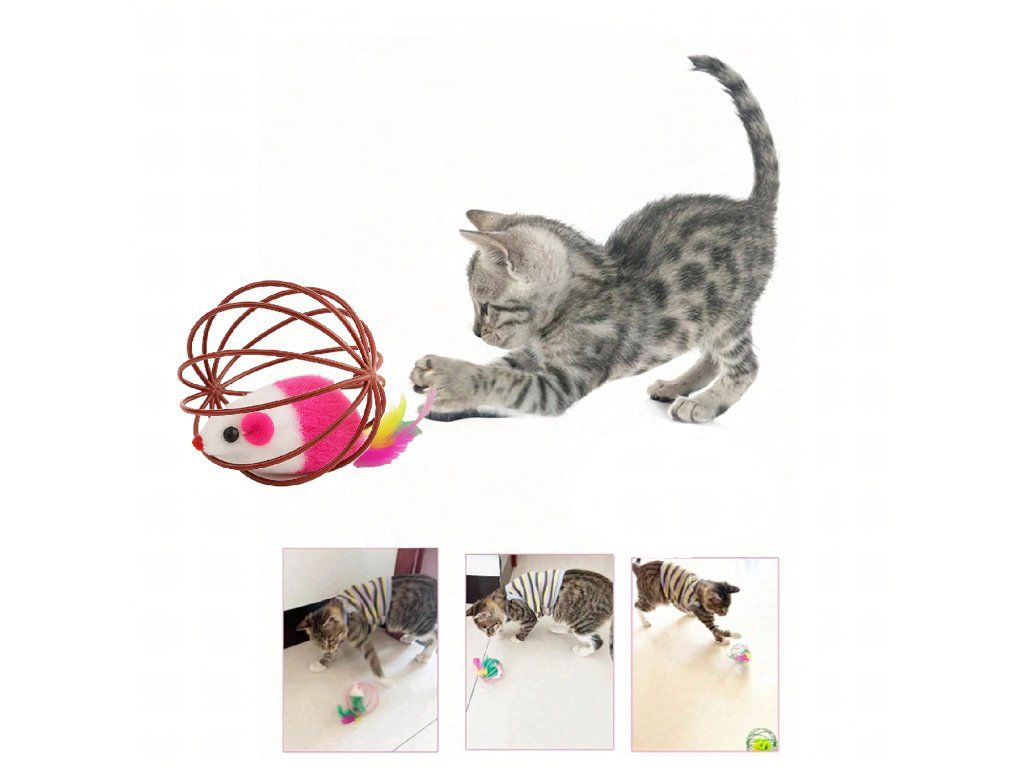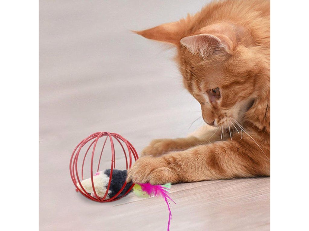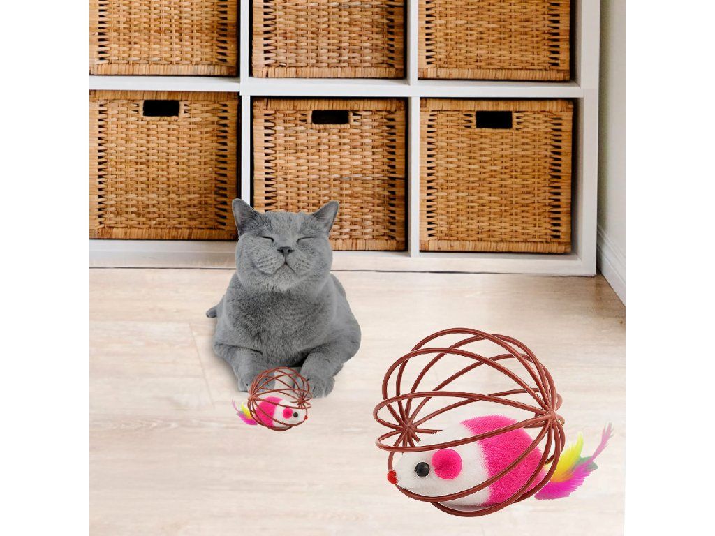 ⬛Hračka pro kočky – interaktivní míček s myškou, peříčky a chrastítkem – drátěná koule⬛