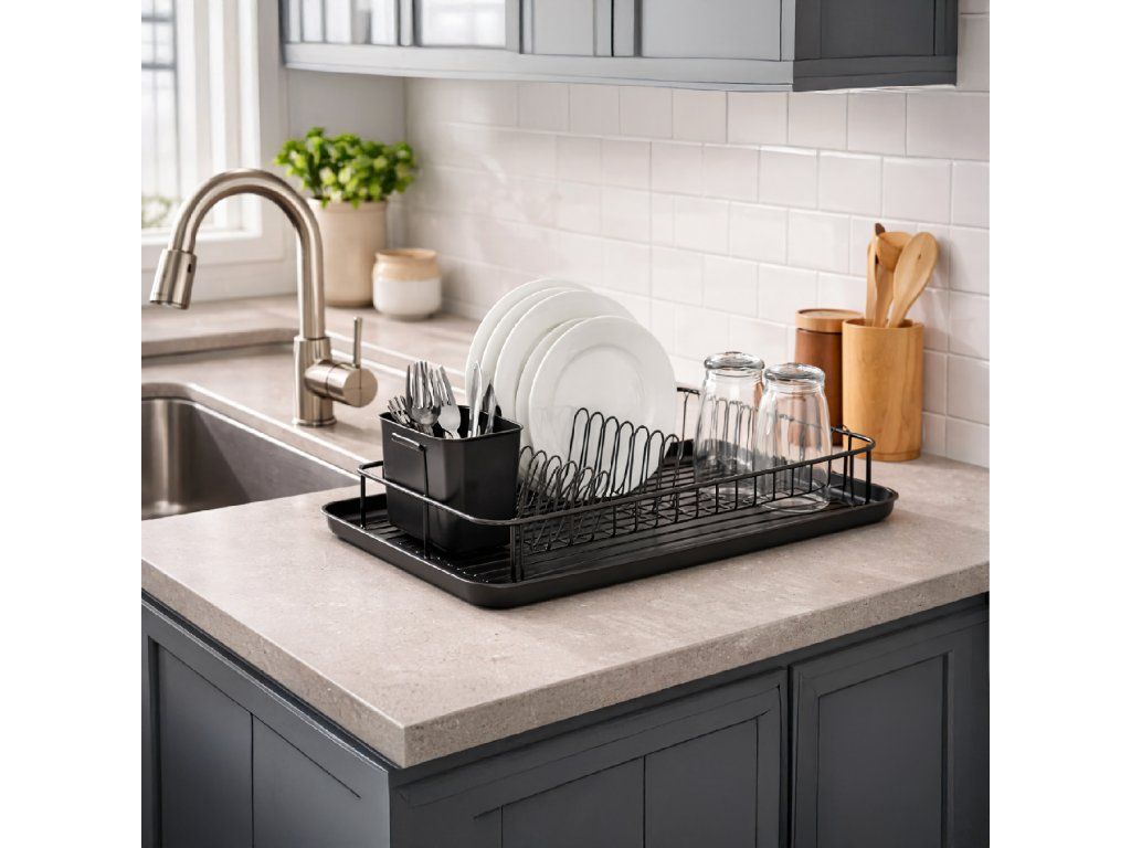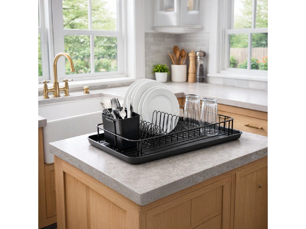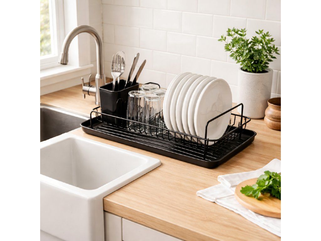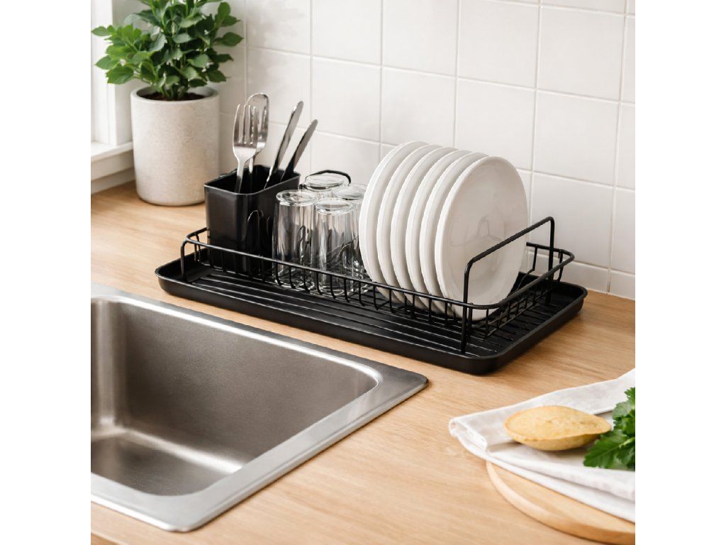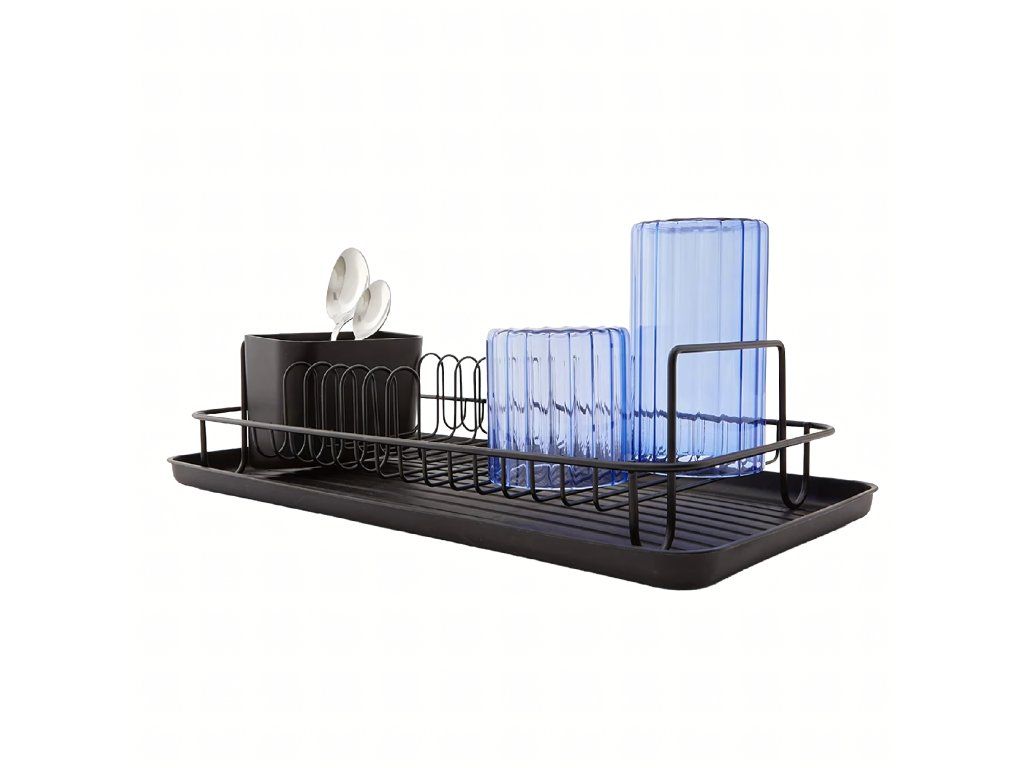 Jednopodlažní stojací sušič nádobí s odkapávačem, černý, velký zásobník