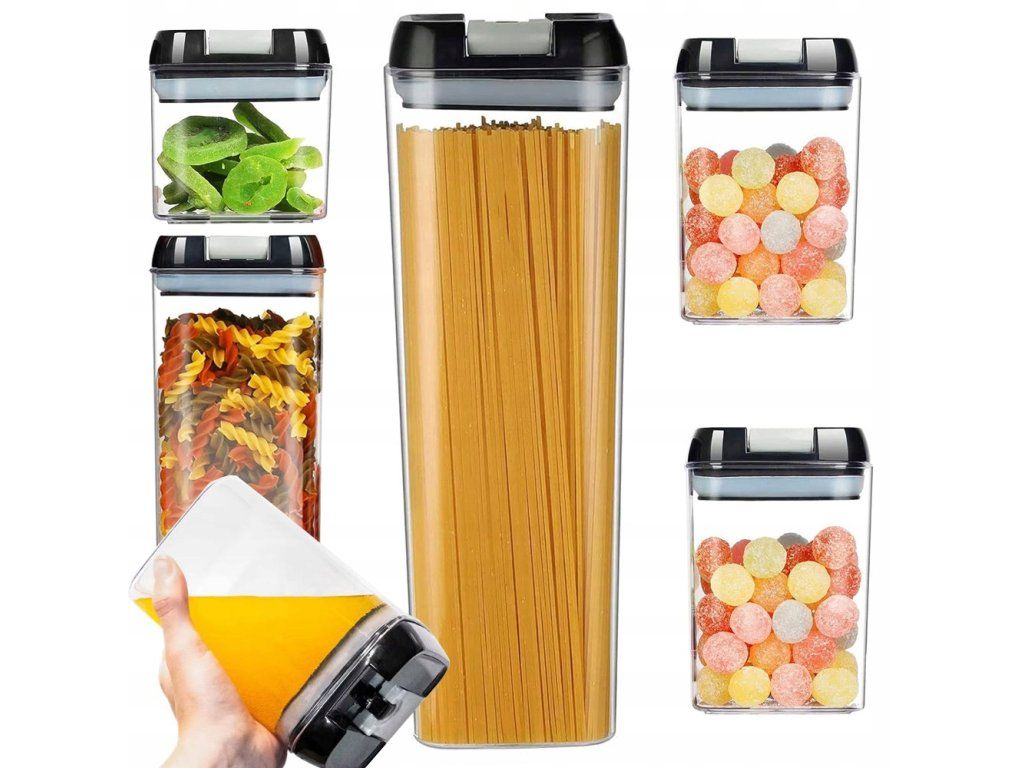 Sada 5 praktických kuchyňských nádob s hermetickým uzávěrem je ideálním řešením pro skladování těstovin, rýže, kaše, cereálií, kávy, čaje, sušenek nebo sladkostí. Díky těsným víčkům si produkty déle zachovávají čerstvost a aroma a jejich obsah je dobře chráněn před vlhkostí a hmyzem.