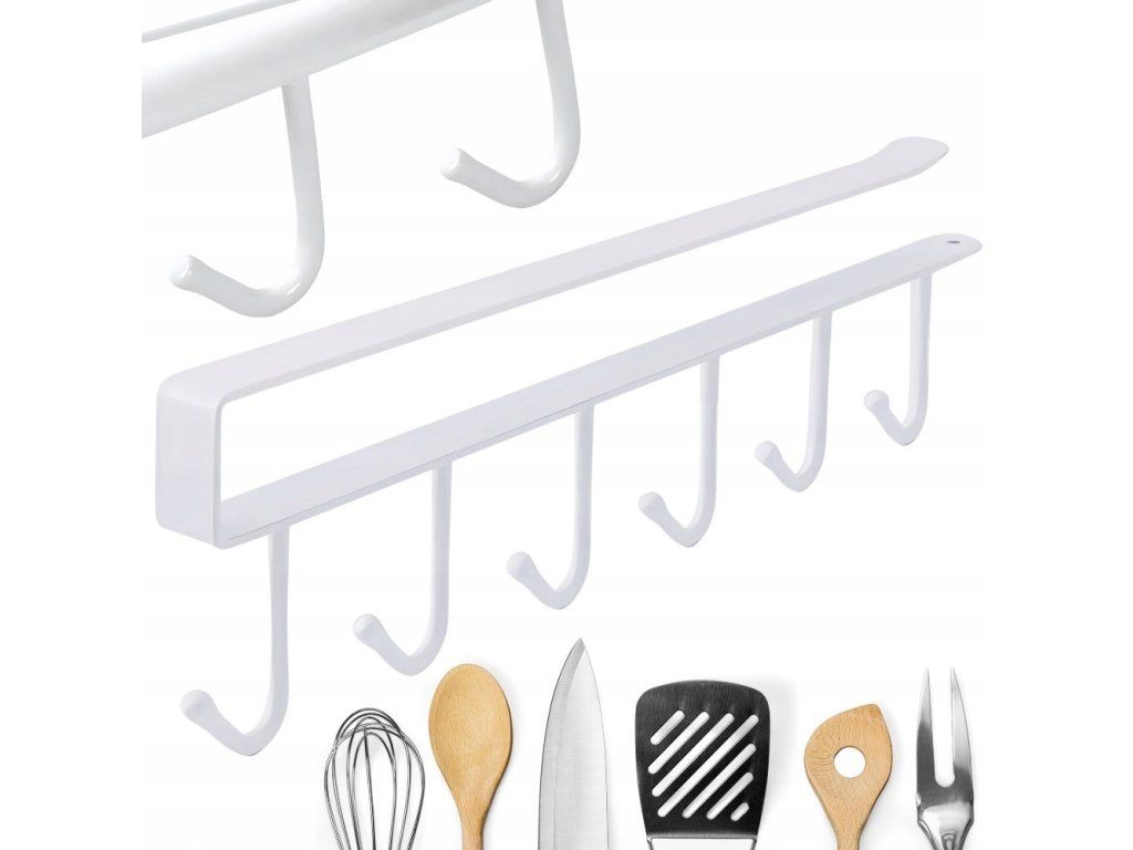 Věšák má 6 robustních háčků, které jsou ideální pro zavěšení lžic, špachtlí, nožů, kuchyňských rukavic nebo naběraček. Jednoduchá instalace bez vrtání umožňuje jeho upevnění pod polici nebo skříňku. Matná bílá barva se hodí k většině moderních kuchyní a doplňků.