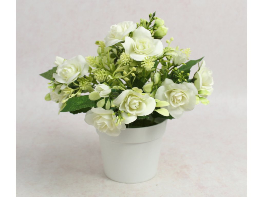 Květ RŮŽE v bílém květináči výška 20 cm (květ 5x1,5 cm) BÍLÁ
