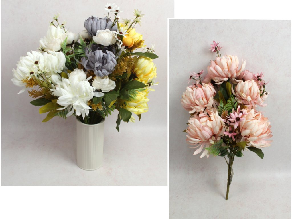 Kytice CHRYZANTEMA s doplňky výška 54 cm, 13 stonků (8 květů 11-6 cm) mix barev