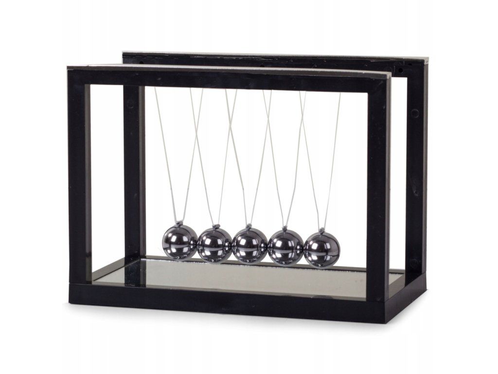 Když jednu kuličku přitáhneme a pustíme, narazí do ostatních a poslední kulička se odrazí zpět do téměř stejné výšky. Je to proto, že srážky míčků jsou pružné a jejich kinetická energie a hybnost se zachovávají.