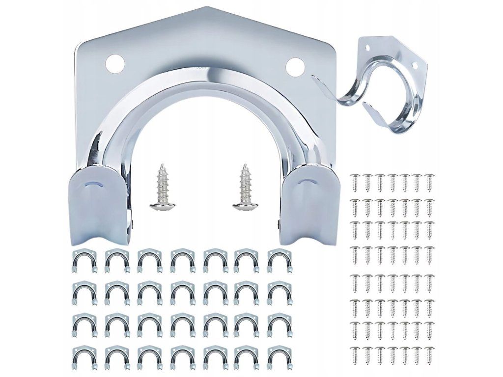 Držáky jsou vyrobeny z robustního kovu. Každý držák byl vhodně tvarován, aby zajistil stabilní a bezpečné upevnění různých předmětů. Součástí balení jsou také montážní šrouby vhodné velikosti, které výrazně usnadňují instalaci a zajišťují trvanlivé upevnění na stěnu.