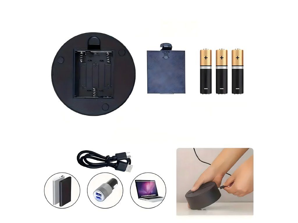 USB: Kabel Micro USB (součástí balení) umožňuje připojení k počítači, powerbance nebo síťovému adaptéru. Baterie: 3 x AA (nejsou součástí balení) – umožňují použití lampičky v místech bez přístupu k elektřině.