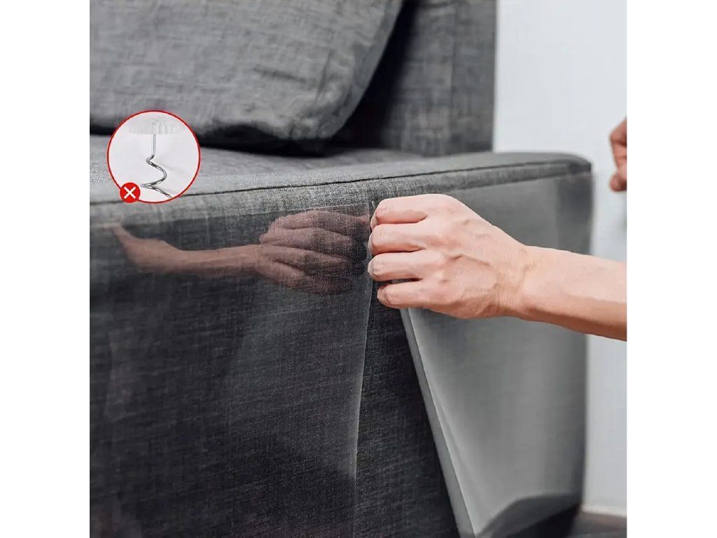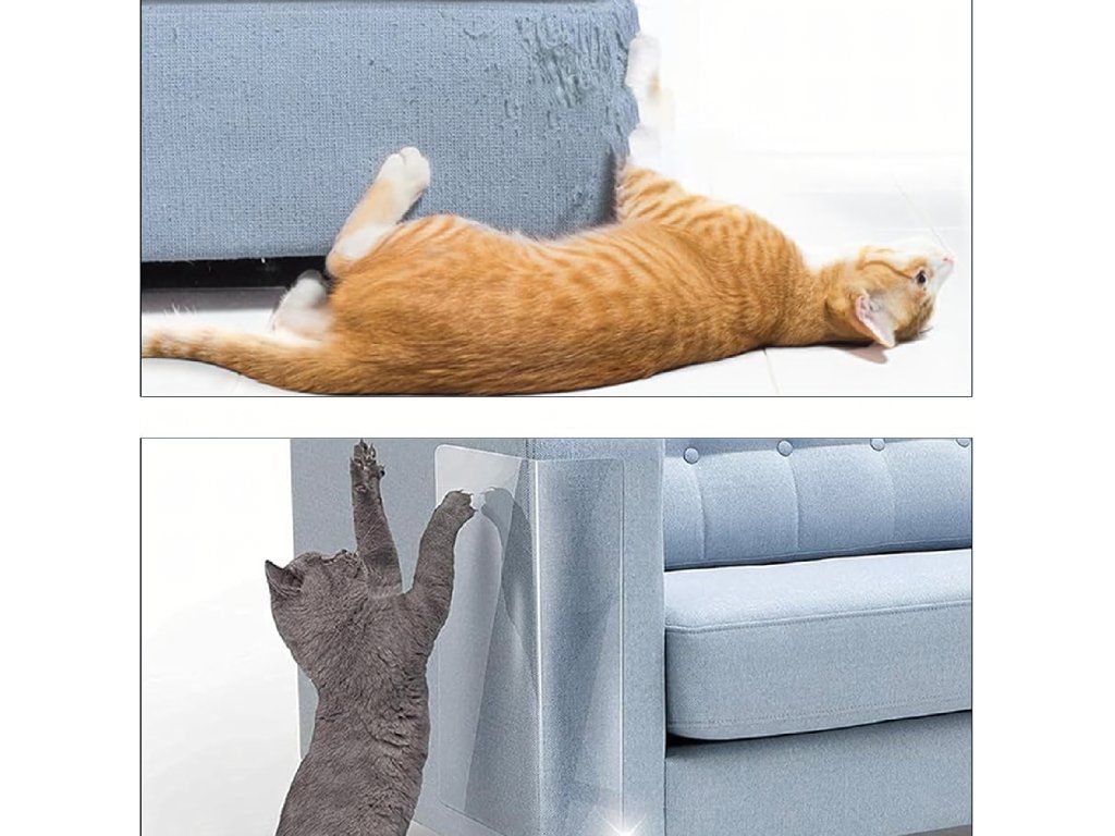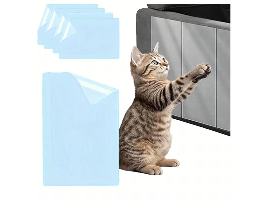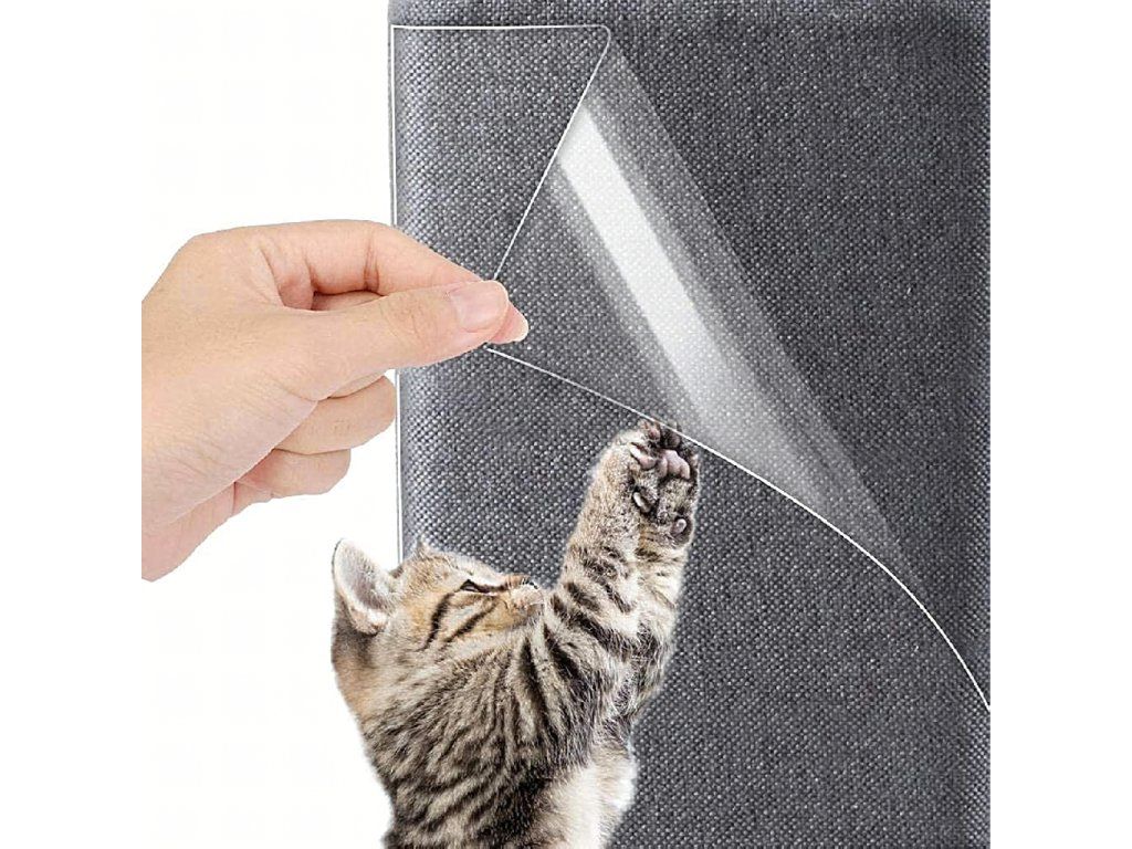 Průhledná ochranná fólie 45×15 cm (5 ks) účinně chrání nábytek, dveře a další povrchy před poškrábáním kočkou, je snadno instalovatelná, opakovaně použitelná, bezpečná pro zvířata a v interiéru neviditelná.