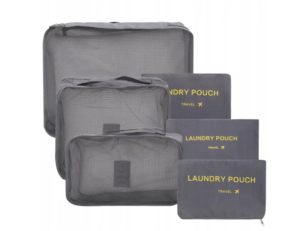 Sada šesti cestovních organizérů, které se skvěle hodí pro zabalení všech potřebných věcí, jako je spodní prádlo, boty, oblečení nebo kosmetika , a pro uložení prádla k vyprání.