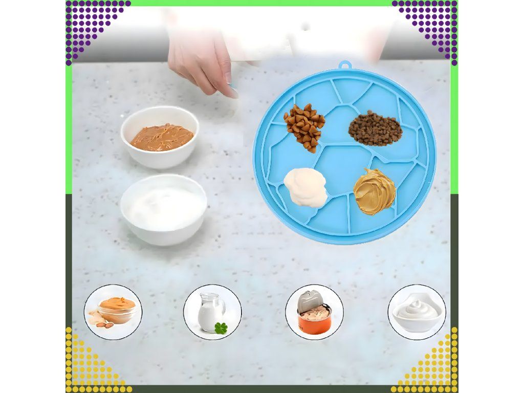 Na podložku můžete nanášet pasty, mokré krmivo, přírodní jogurt (bez cukru) nebo jiné zdravé pamlsky pro zvířata.