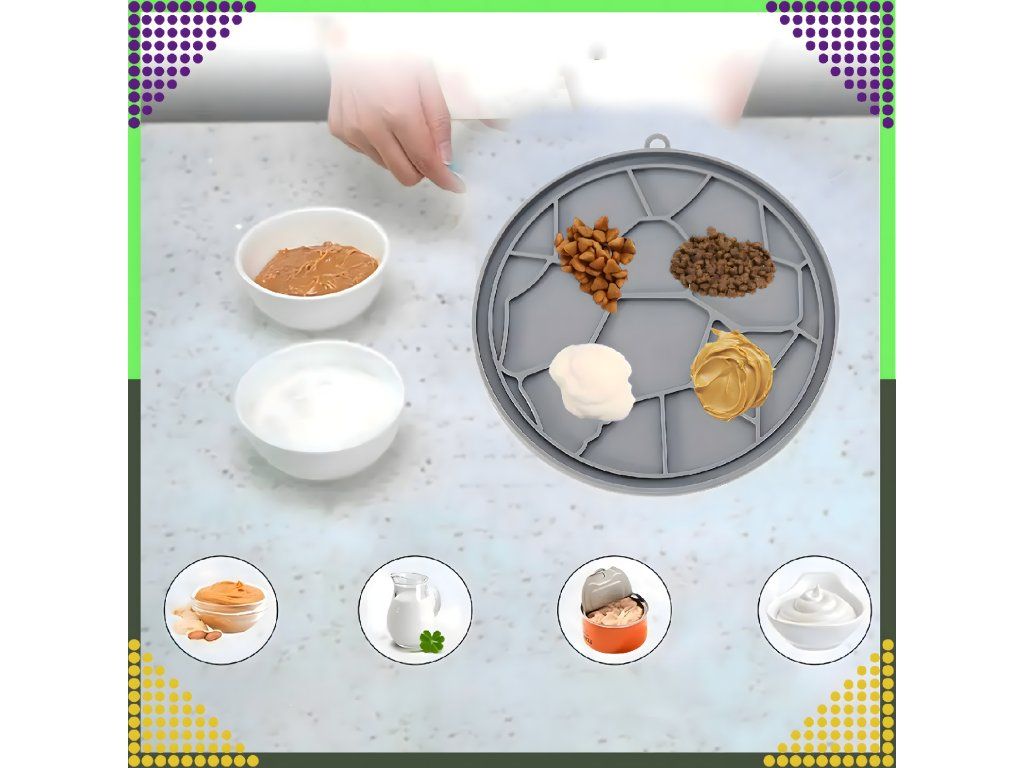 Na podložku můžete nanášet pasty, mokré krmivo, přírodní jogurt (bez cukru) nebo jiné zdravé pamlsky pro zvířata.