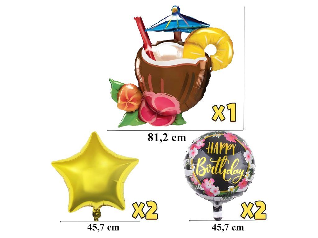 1 balón ve tvaru drinku 81,2 cm, 2 balóny „Happy Birthday” 45,7 cm, 2 zlaté hvězdičky 45,7 cm.
