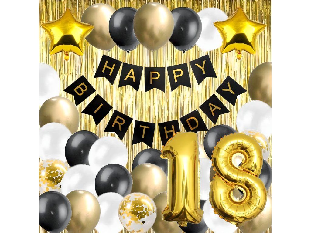 Kompletní sada XXL - 17 černých, 21 zlatých, 9 bílých, 1 s číslem „1 a 8”, 2 s konfetami, nápis „Happy Birthday” a zlatá záclona.