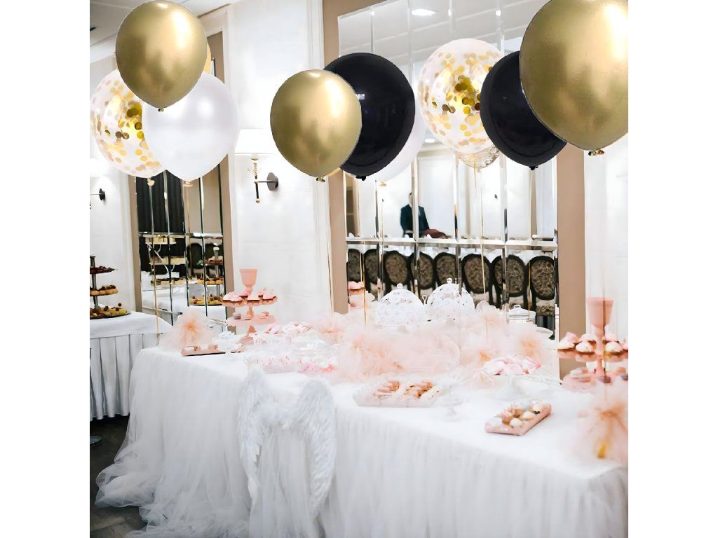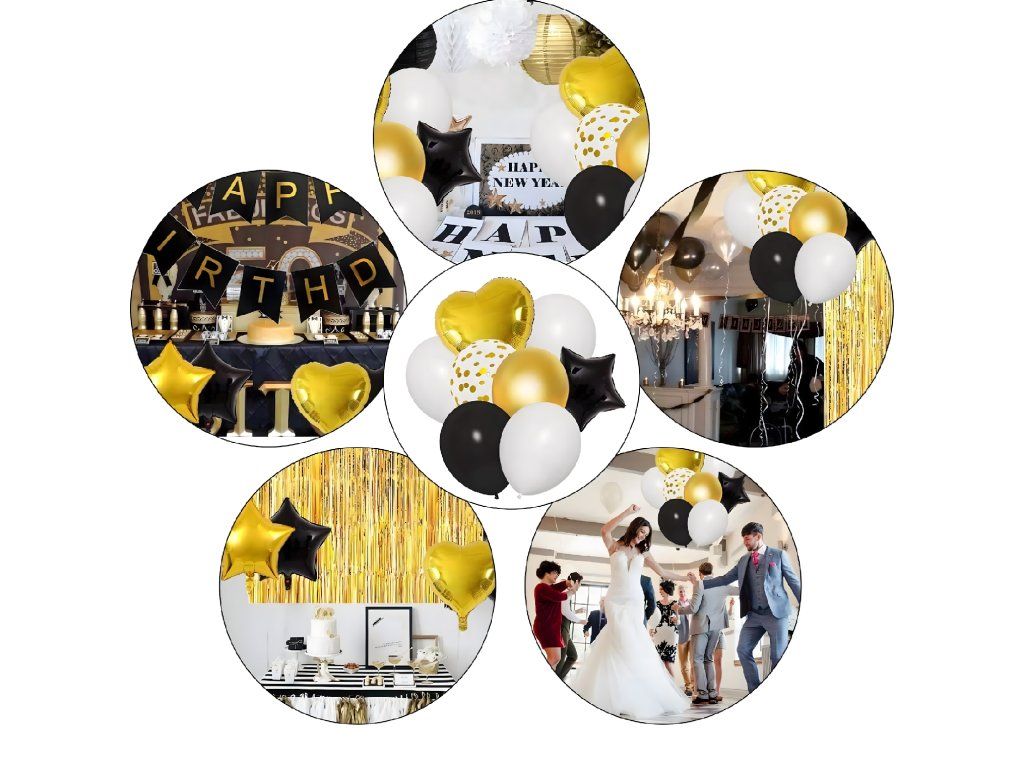 Kompletní sada XXL – 17 černých, 21 zlatých, 9 bílých, 1 s číslicemi „3 a 0”, 2 s konfetami, nápis „Happy Birthday” a zlatá záclona.