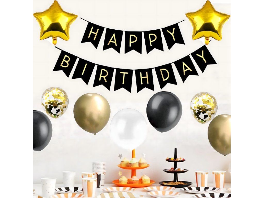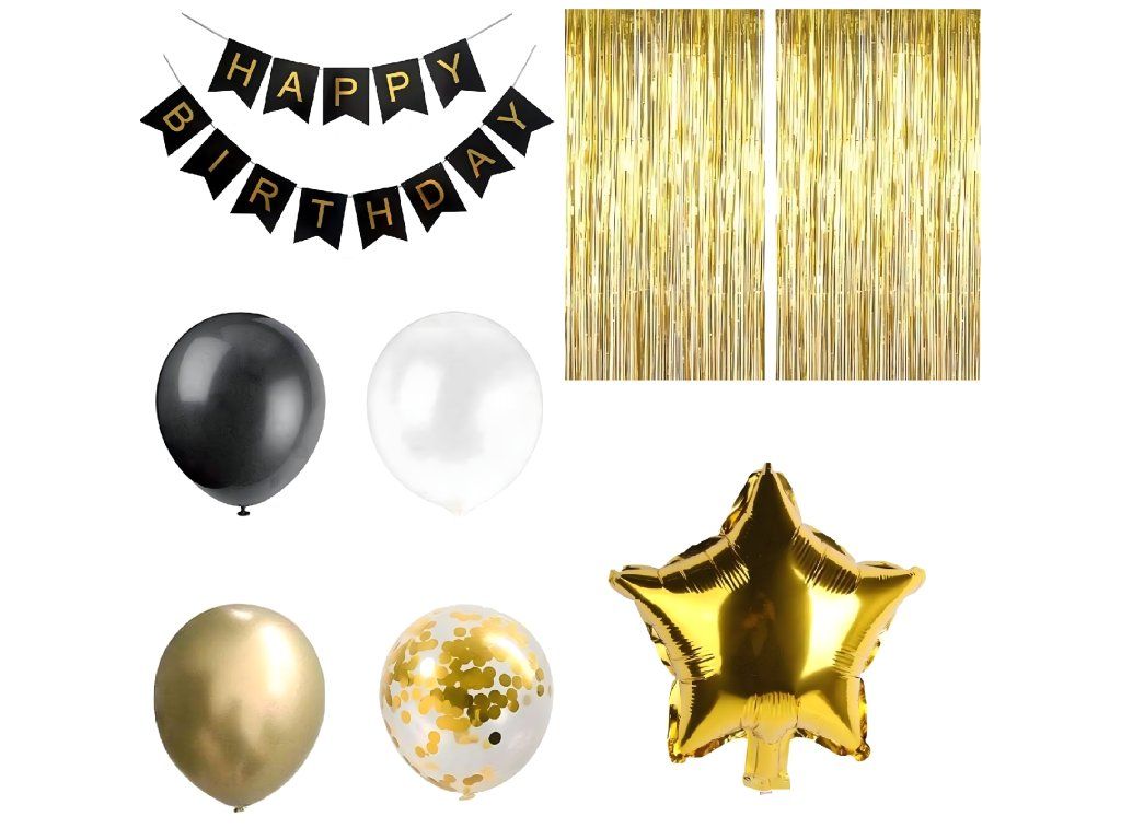 Kompletní sada XXL - 17 černých, 21 zlatých, 9 bílých, 1 s číslicemi „4 a 0”, 2 s konfetami, nápis „Happy Birthday” a zlatá záclona.