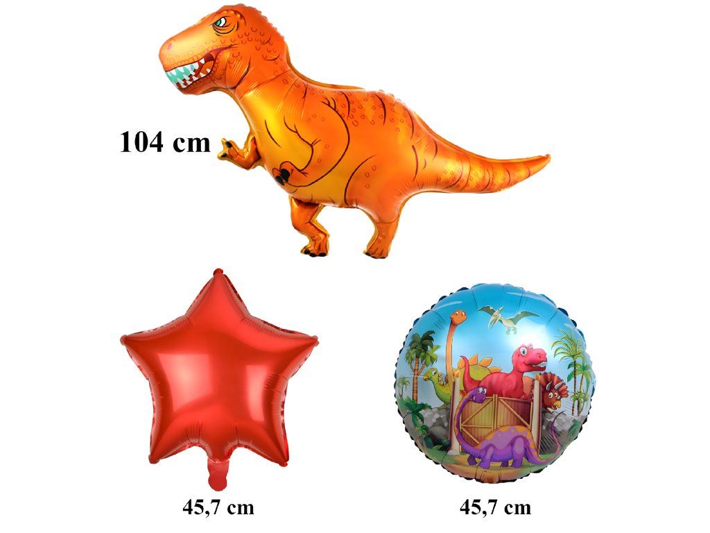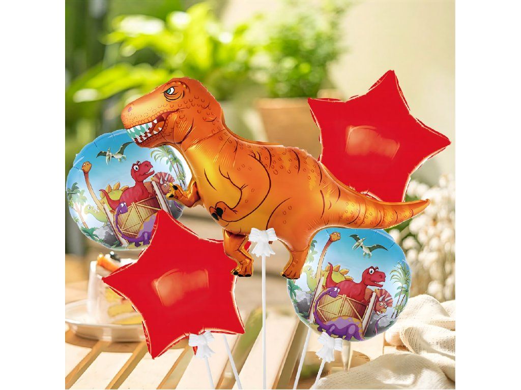 Kompletní sada 5 ks. - 1 balón s motivem dinosaura, 2 kulaté balónky s potiskem, 2 červené hvězdičky.