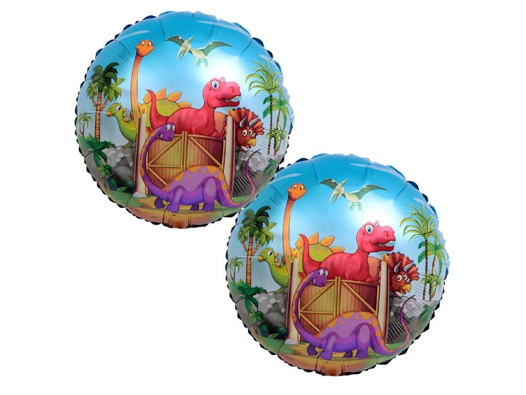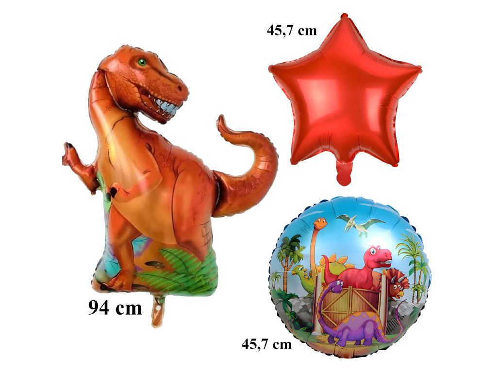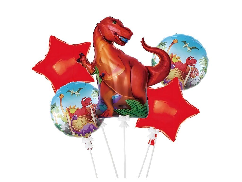 Kompletní sada 5 ks. – 1 balón s motivem dinosaura, 2 kulaté balónky s potiskem, 2 červené hvězdičky.