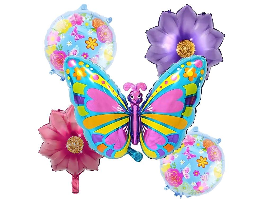 Sada balónků Motýlek 5 ks – velký barevný motýl (75,9 cm), 2 balónky ve tvaru květin a 2 kulaté s potiskem (45,7 cm). Ideální pohádková dekorace na dívčí narozeniny a oslavy! ✨