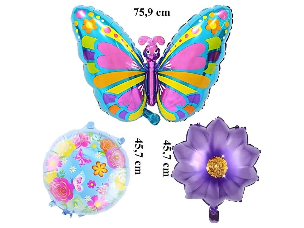 1× motýl 75,9 cm, 2× kvítky 45,7 cm, 2× kulaté balónky s potiskem 45,7 cm (celkem 5 ks).