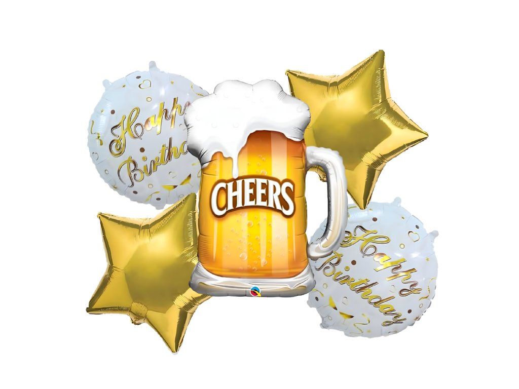 ➡️ 1 balón ve tvaru půllitru piva 63,5 cm „CHEERS”, 2 balóny „HAPPY BIRTHDAY” 45,7 cm, 2 zlaté hvězdičky 45,7 cm.