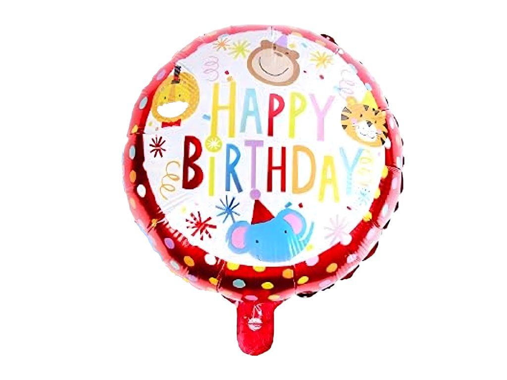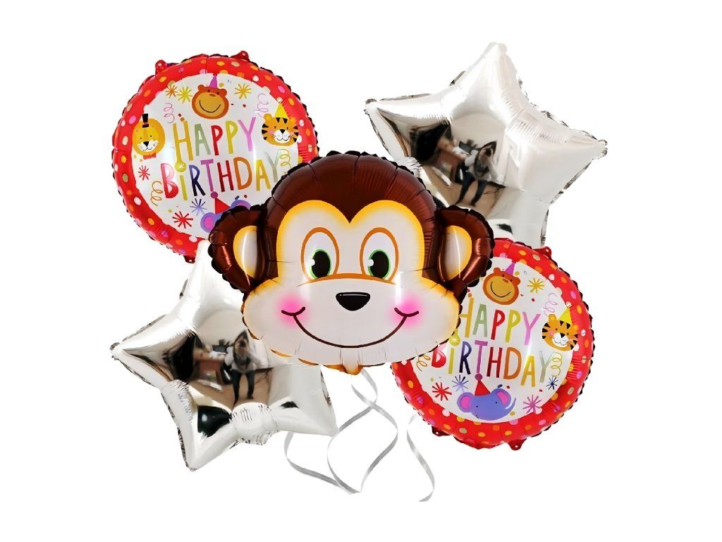 1 balón ve tvaru opičky, 2 balóny „HAPPY BIRTHDAY”, 2 stříbrné hvězdičky – celkem 5 ks.