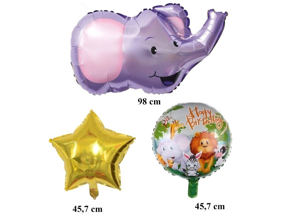 Kompletní sada 5 ks. - 1 balón ve tvaru slona, 2 kulaté balónky „Happy Birthday“, 2 zlaté hvězdičky.