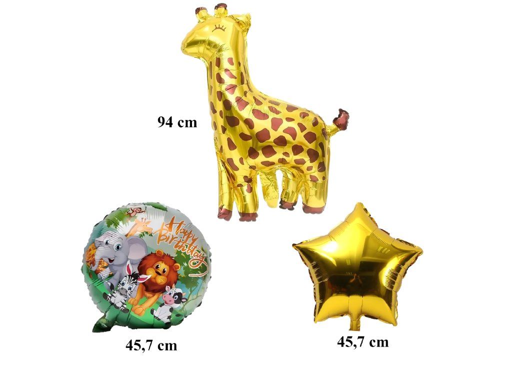 Kompletní sada 5 ks. - 1 balón žirafa, 2 kulaté „HAPPY BIRTHDAY”, 2 stříbrné hvězdičky.