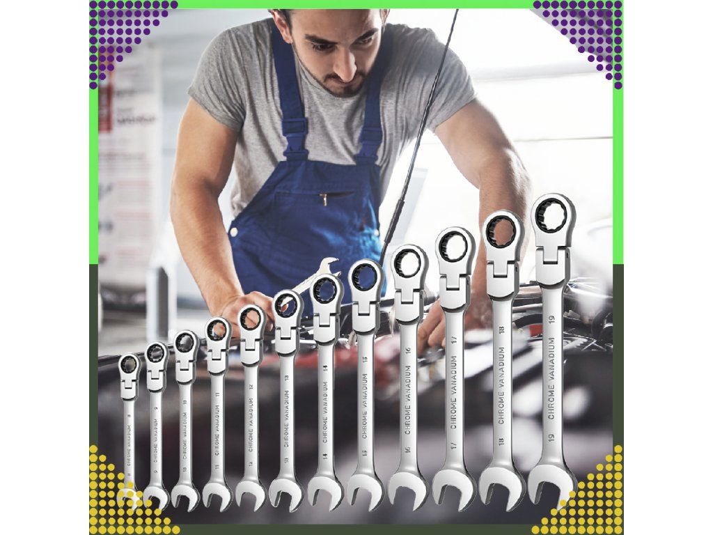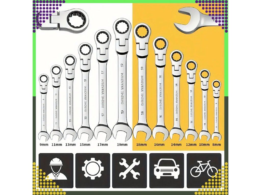 ✔️ 6 nejoblíbenějších plochých klíčů s ráčnou: 8 mm, 10 mm, 13 mm, 15 mm, 17 mm, 19 mm.
