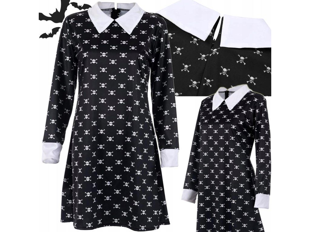 Hlavní částí kostýmu je klasická černá šaty s bílými lebkami, které přesně odrážejí charakteristický styl této postavy. Šaty mají dlouhé rukávy zakončené bílými manžetami, které jim dodávají jedinečný vzhled. Jsou vyrobeny z pružného materiálu, který zajišťuje pohodlí a perfektní padnutí.