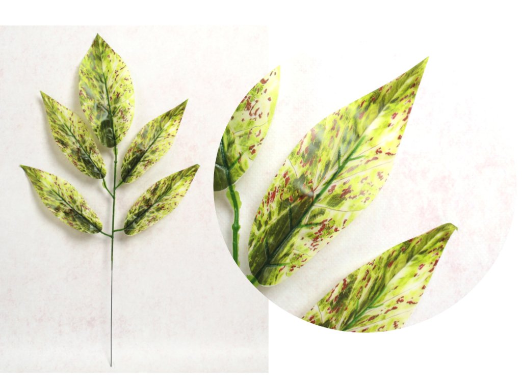 Silikonový list 1-ramienny PODŁUŻNY 60 cm zelený skvrnitý, s červenými skvrnami - 1 ks