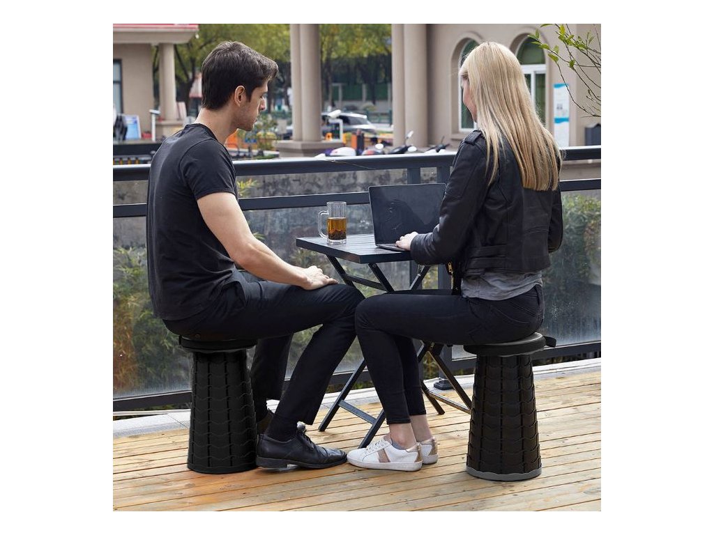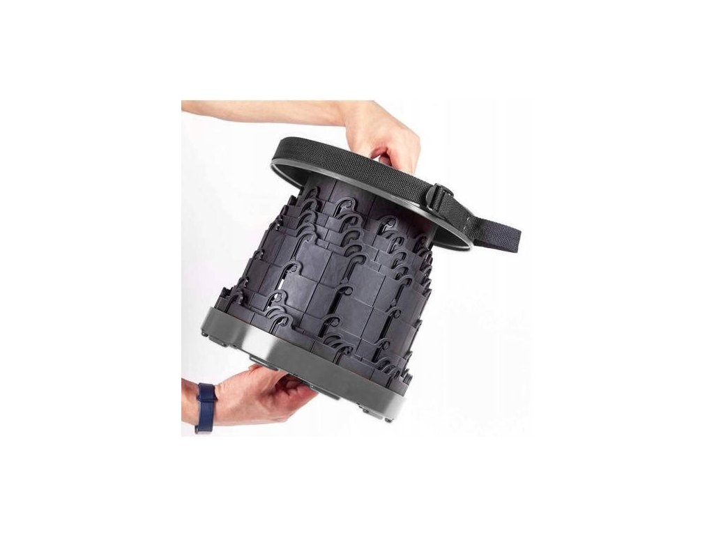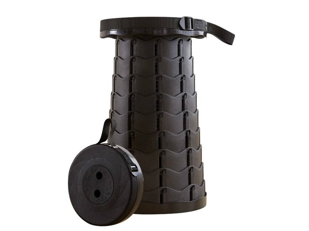 Kulatý rozkládací přenosný taburet, užitečný pro kempování.