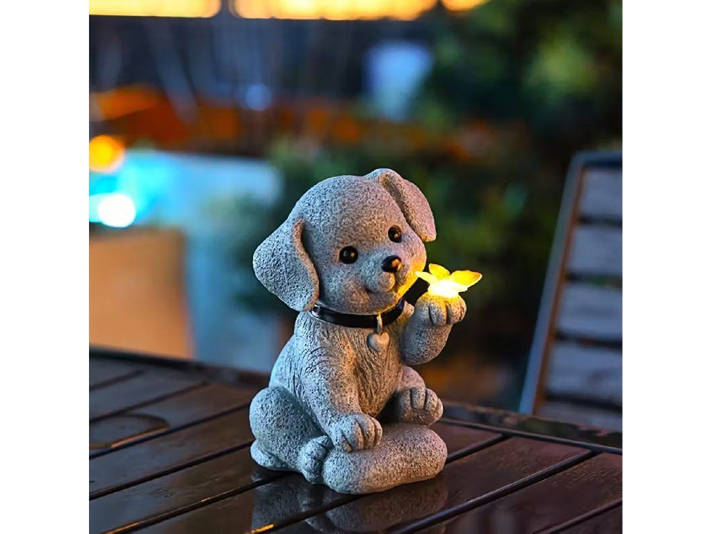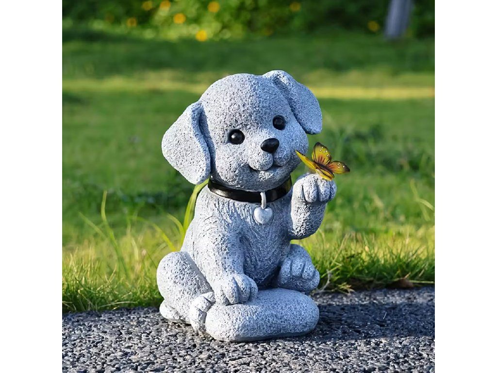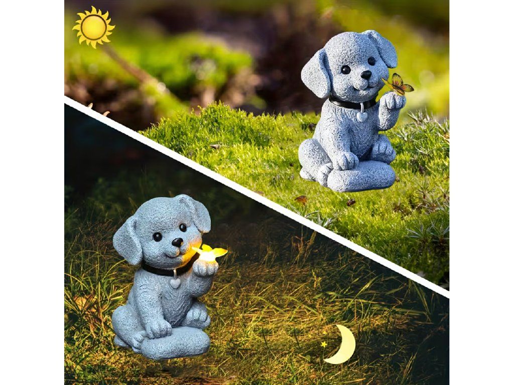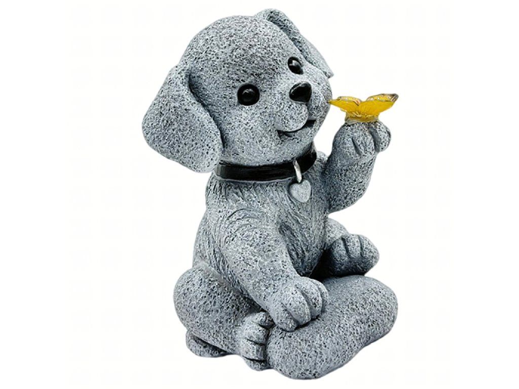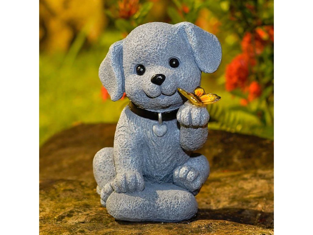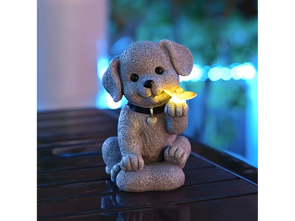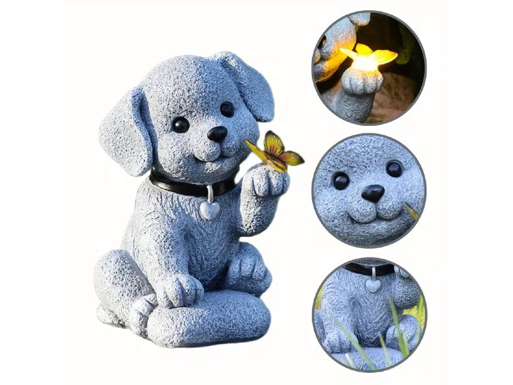 Solární zahradní lampa, dekorativní ozdoba, pes s motýlem, LED dekorace