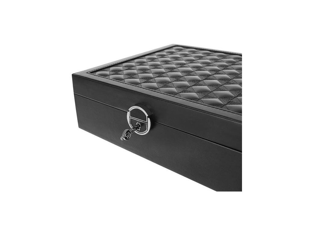PROSTORNÝ – pouzdro se skládá z: odnímatelného krytu se 2 přihrádkami s válečky na prsteny, 4 přihrádek na ostatní šperky a odnímatelné krabičky. Ve spodní části je 6 dalších přihrádek, 2 vložky na hodinky nebo náramky a 1 velká, obdélníková přihrádka na větší předměty. Přihrádky jsou vystlány měkkým materiálem pro ochranu jemných šperků proti poškrábání.