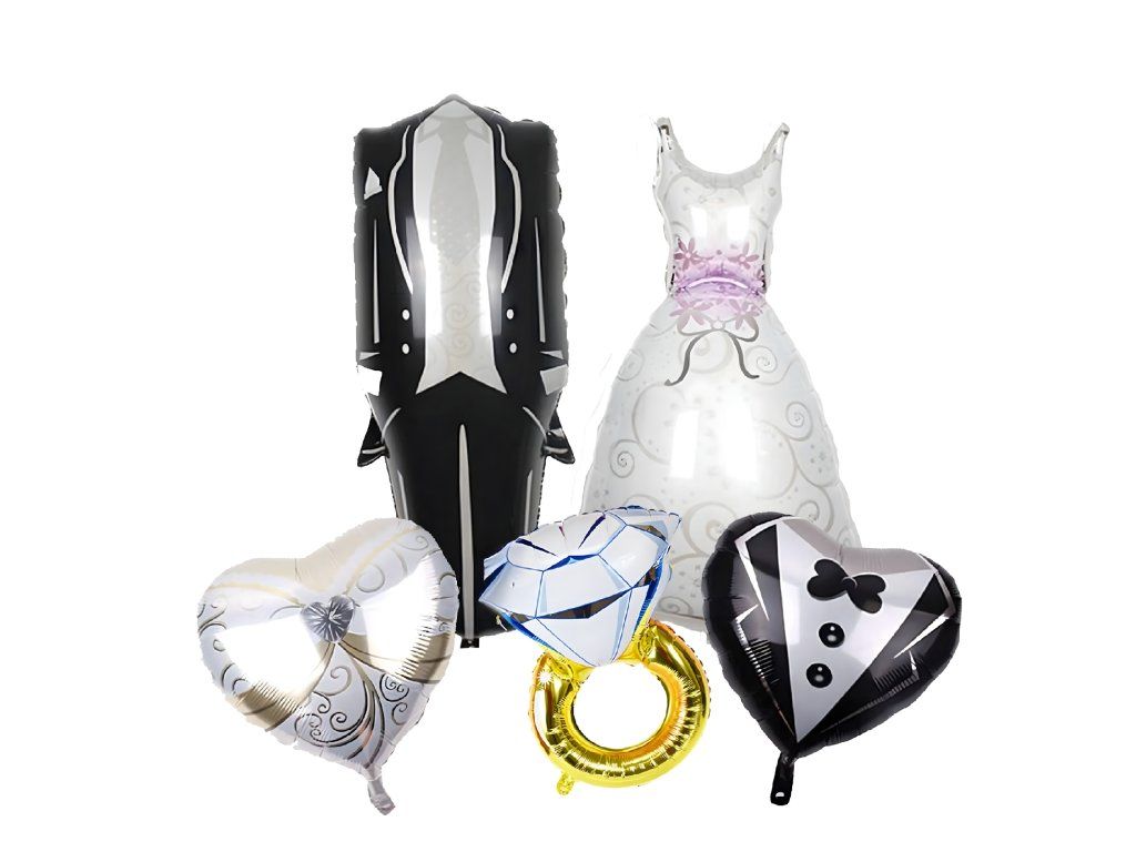 Kompletní sada 5 balónků – svatební šaty, oblek, 2 srdce a zásnubní prsten.