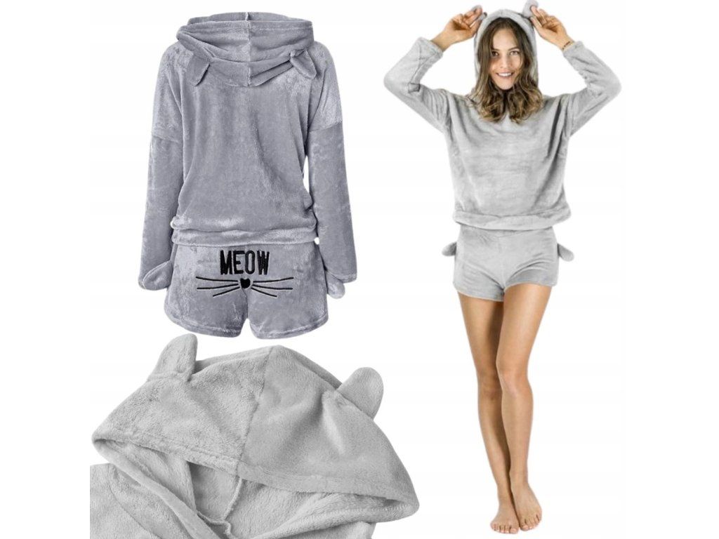 Teplé dámské pyžamo s kapucí, plyšové, vel. L, šedá