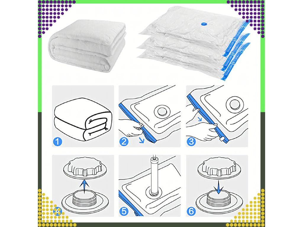 ⭐ Skladování různých předmětů: Vakuové pytle neslouží pouze ke skladování oblečení. Můžete v nich uchovávat také deky, ložní prádlo, polštáře, hračky nebo jiné věci, které chcete na nějakou dobu schovat.