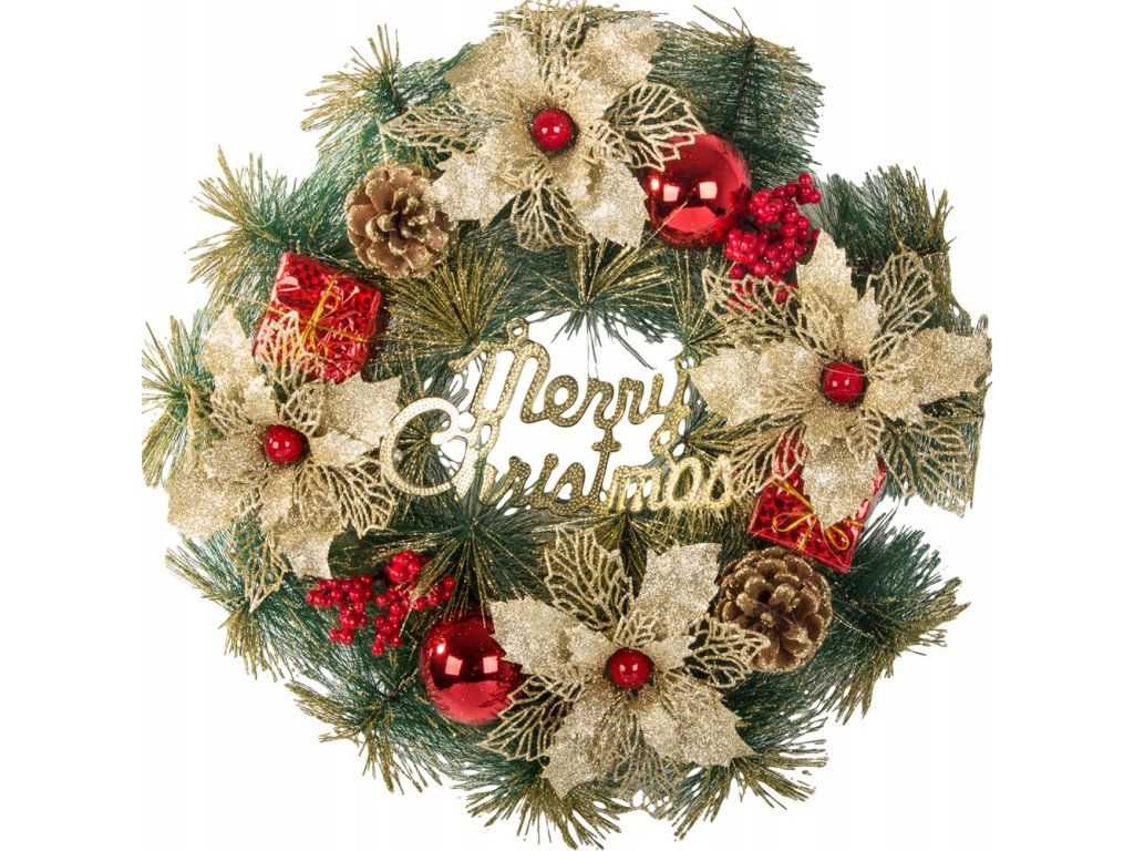 Věnec je vyroben z kvalitních borovicových větví (umělých, realistických, pozlacených), ozdoben přírodními šiškami, cetkami, dárky, umělými květinami a velkým nápisem Merry Christmas.