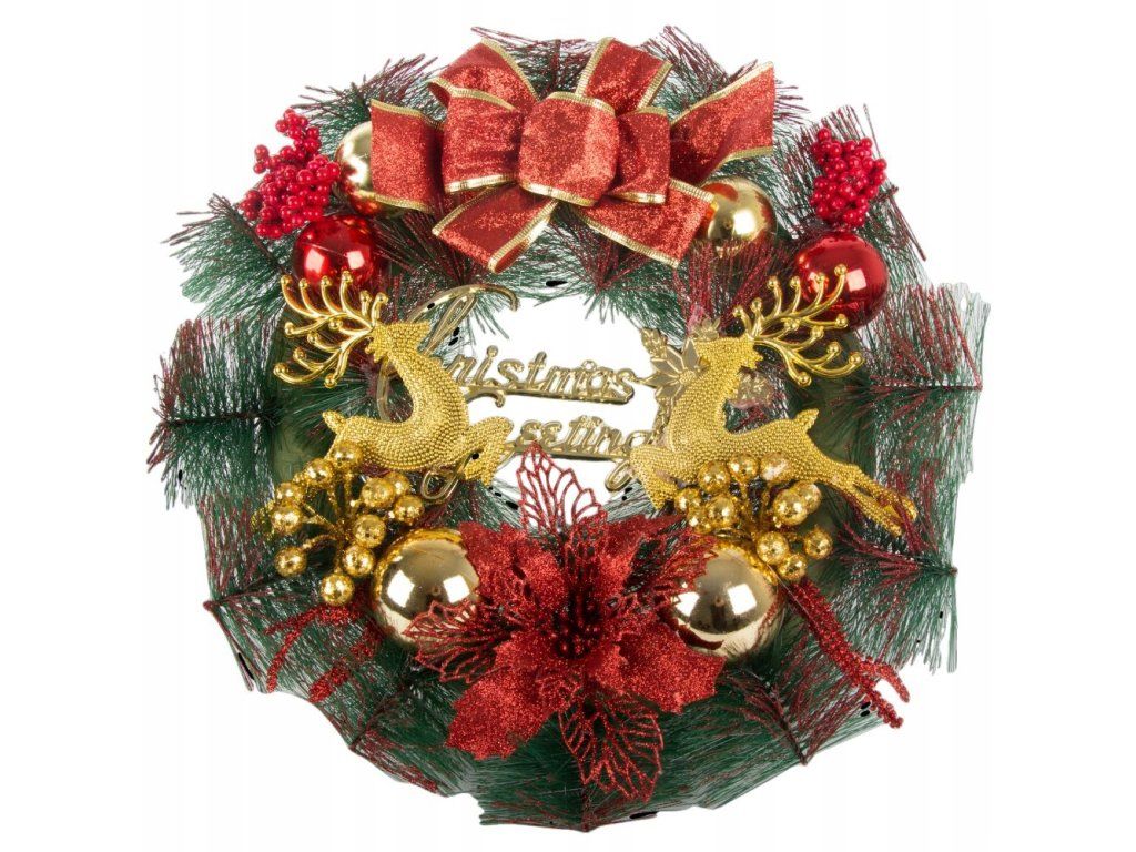 Tradiční vánoční barvy. Věnec je velmi bohatě zdobený.