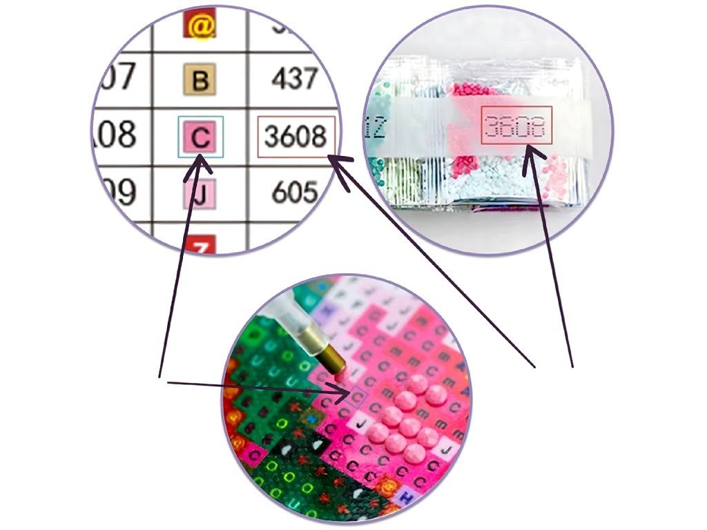 Diamanty jsou dodávány v sáčcích a jsou roztříděny podle barev. Každý sáček je očíslován a označen příslušnými symboly, což usnadňuje jejich identifikaci a umístění na plátno.