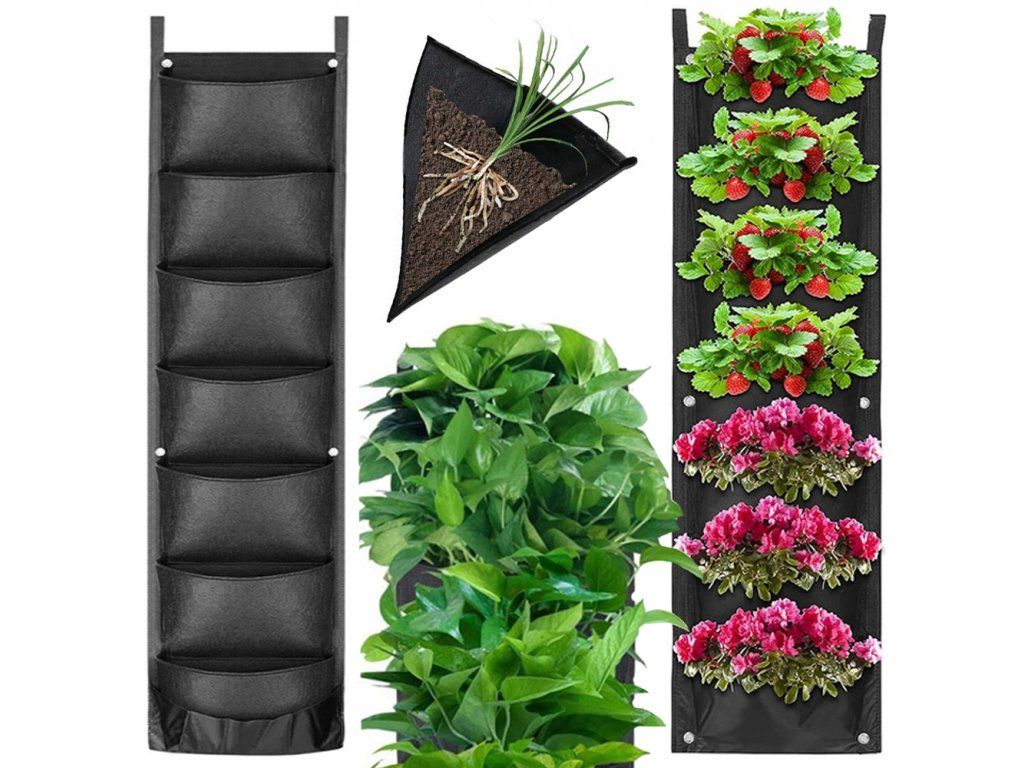 Závěsný plstěný květináč se sedmi prostornými kapsami je moderní a jednoduchý způsob, jak vytvořit malou zahrádku na balkoně, terase nebo na zdi.