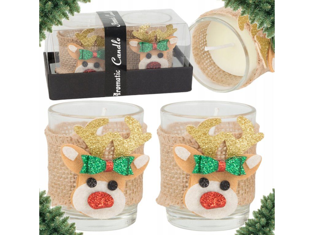 Svíčky jsou uloženy v čirém skle, omotány jutovou stuhou a v jejich čele je sob se zlatými rohy, zelenou mašlí a lesklým červeným nosem. Dodejte svému interiéru nádech vánočního kouzla!