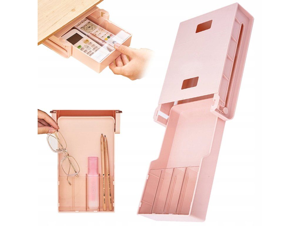 Zásuvka, kteroulze umístit pod stůl nebo jinou pracovní desku a získat tak další prostor pro uložení drobných předmětů. Zásuvka se neinvazivně připevňuje k desce stolu pomocí silné oboustranné lepicí pásky. Lze ji použít k ukládání kancelářských potřeb, jako jsou pera nebo fixy. praktické a stylové řešení, které ještě více zpřehlední váš pracovní prostor.
